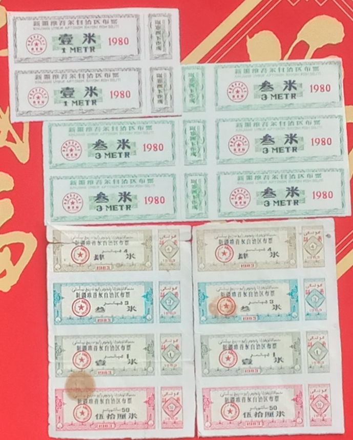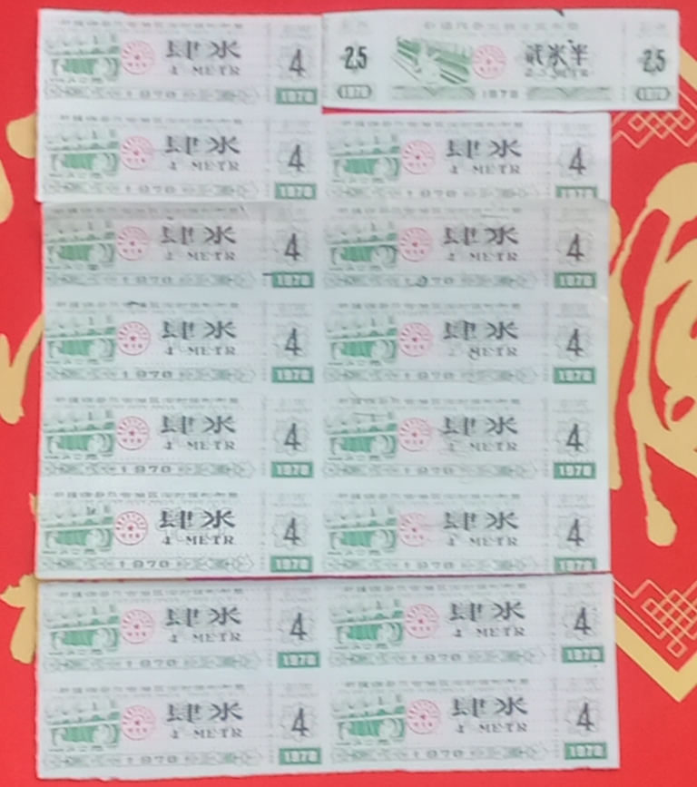 78年4米布票15枚 ,每枚售8元一枚,一米的2枚,每枚6元。2.5米的1枚 售10元。80年3米的5枚每枚售6元。83年布票两套,每套售8元。共188元。
