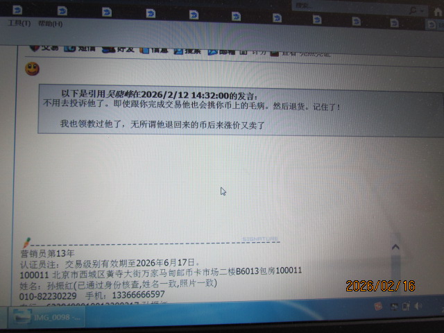 求我退2500元,就不要退了,收到货后大跌当时公斤币价格已是25000元,他说的家条件我很同情他,没有给他退,请大家看看这品相有白雾和白点32500元,退我2500元,和30000元了。咱们就算积德吧,没想到过了10几天翻脸不认人,无中生有颠倒黑白胡乱喷人,大过年的我不多说,我只说是个小人流氓,脏话我骂不出来,30000元的猫币的品相