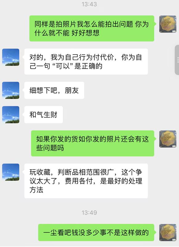 以下是引用黄勇平在2026/3/1 13:45:00的发言: 大家先看几个照片 帮忙评判一下到底是谁的问题 客户明知道自己 品相不好 拍照片给我看 拍的的照片很好,结果我收到货很差 不把有问题地方拍出来 结果我收到货完全不是一个东西 。我直接快递拒签 现在 他已拍的好的照片 说我确认。已我确认 原因让我出运费 运费不多 但是事不是这样做的 以后大家小心这个人 一尘我求购要求写的很清楚 我的要求 同样都是拍照片我收到货怎么就能拍出问题 而 卖家就拍不出来问题