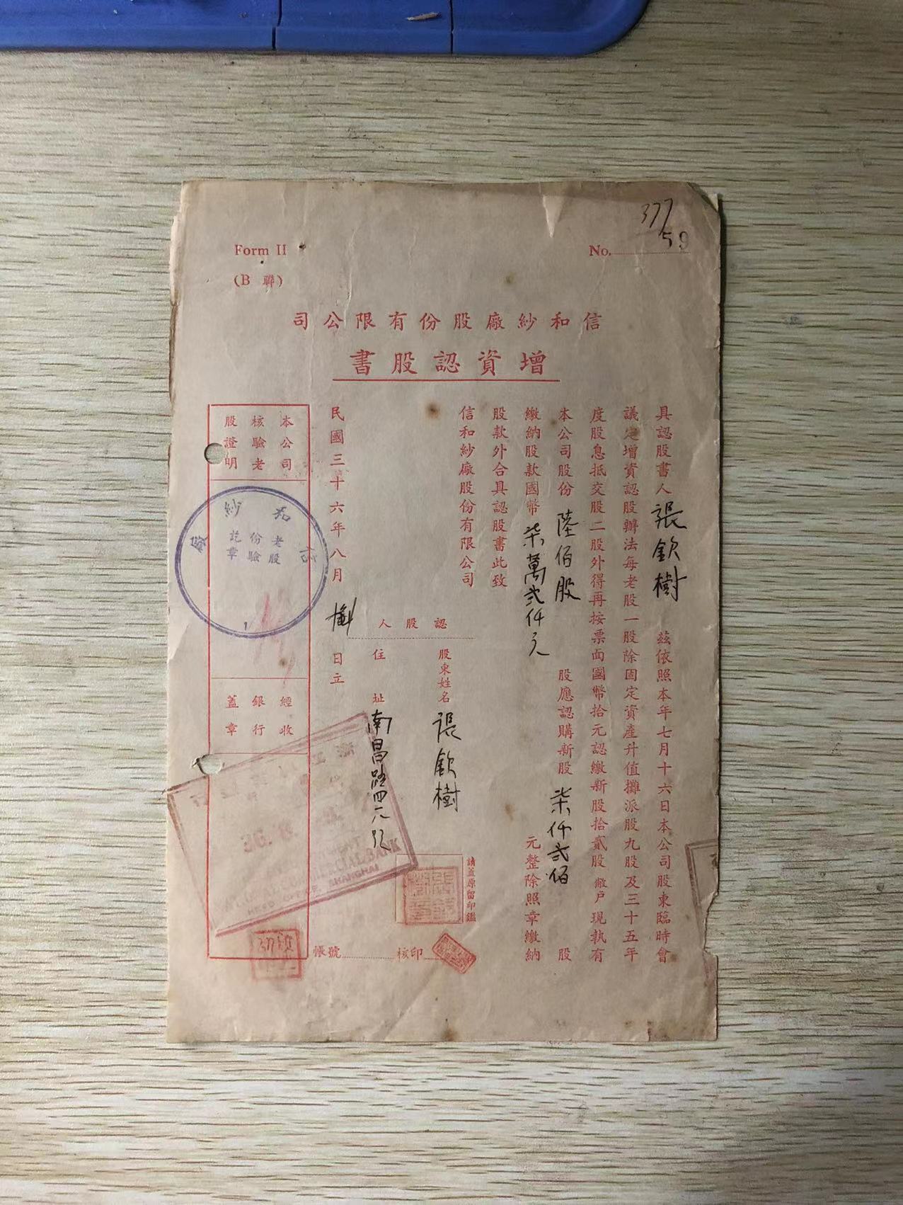 → [原创]【民国期间增资认股书】信和纱厂股份有限公司