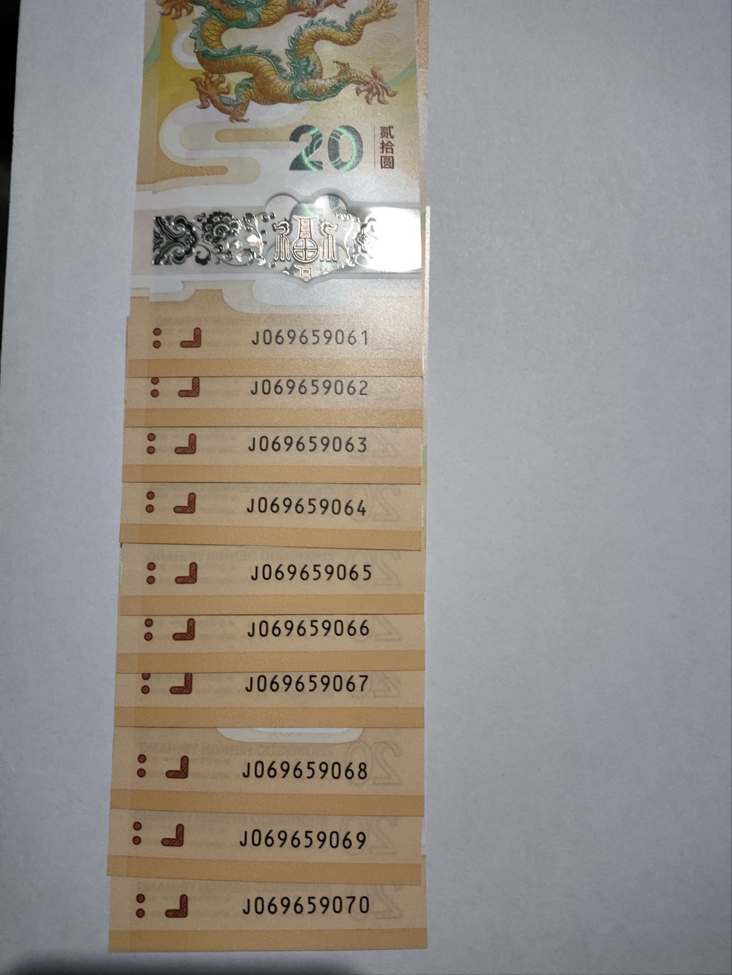 而且20张,前面都是06961倒置号,后面2051--2070都是年份号。张张都是倒置号+年份号。