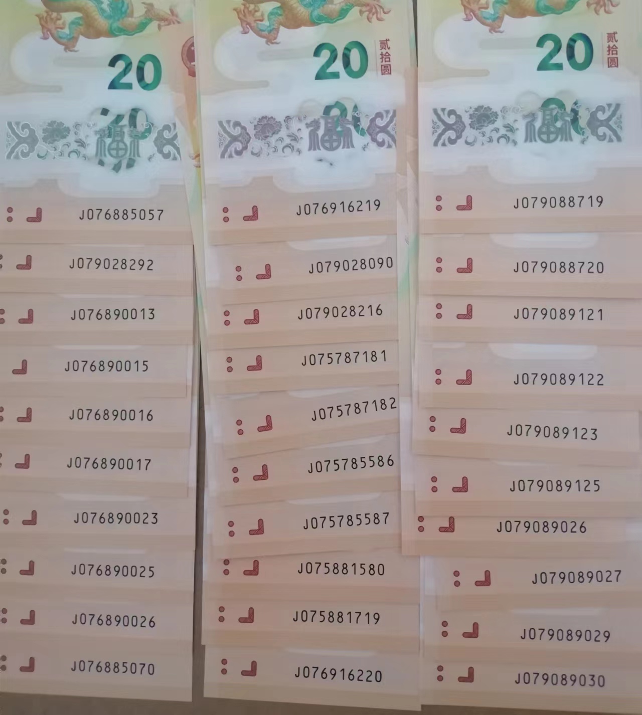 具体号码见图,无4小龙钞43张单价60元,带4小龙钞15张单价57元