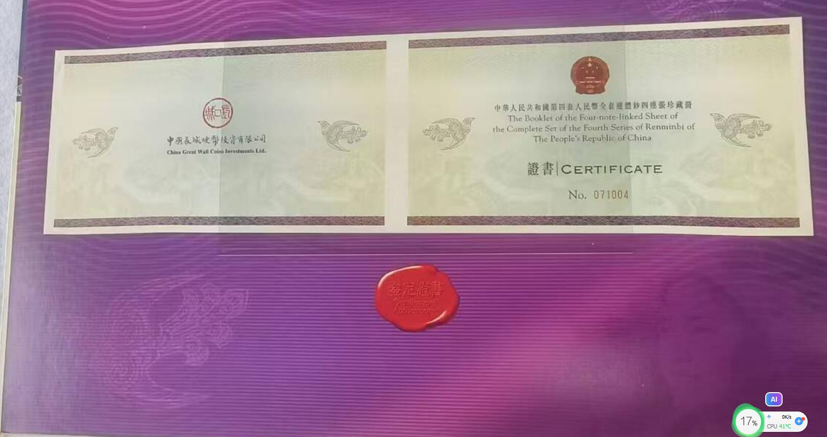 原票全新 ,灯下无斑,证钞 齐全对号 。除了2角有天然出厂油迹无其他问题。