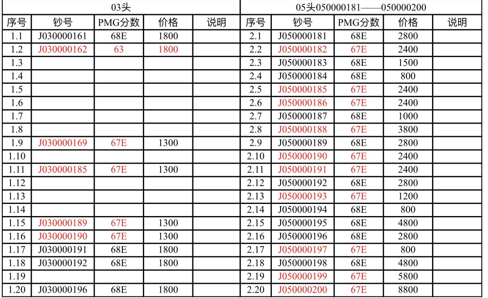 PMG评级小开门010000161----010000200、050000181----050000200、03头部分尾7同号