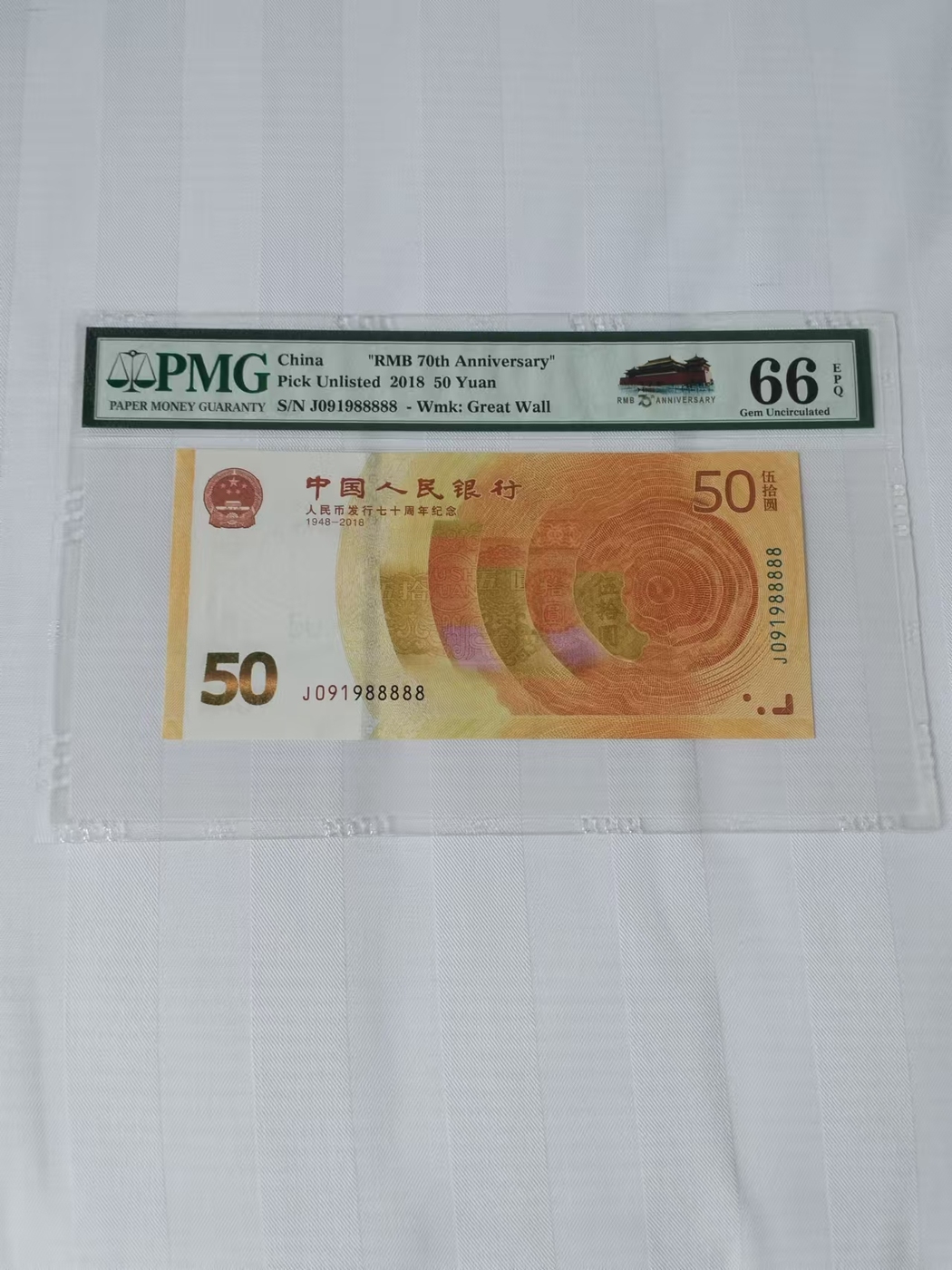 低出黄金钞精品靓号J091988888PMG66E一张,补号倒置号尾88888,0198组合,人四,独0独1十98组合,充实号,多种好号集于一身,低售1万元,不议价!款到三包顺丰!确认后电联或加微信tmw899联系!