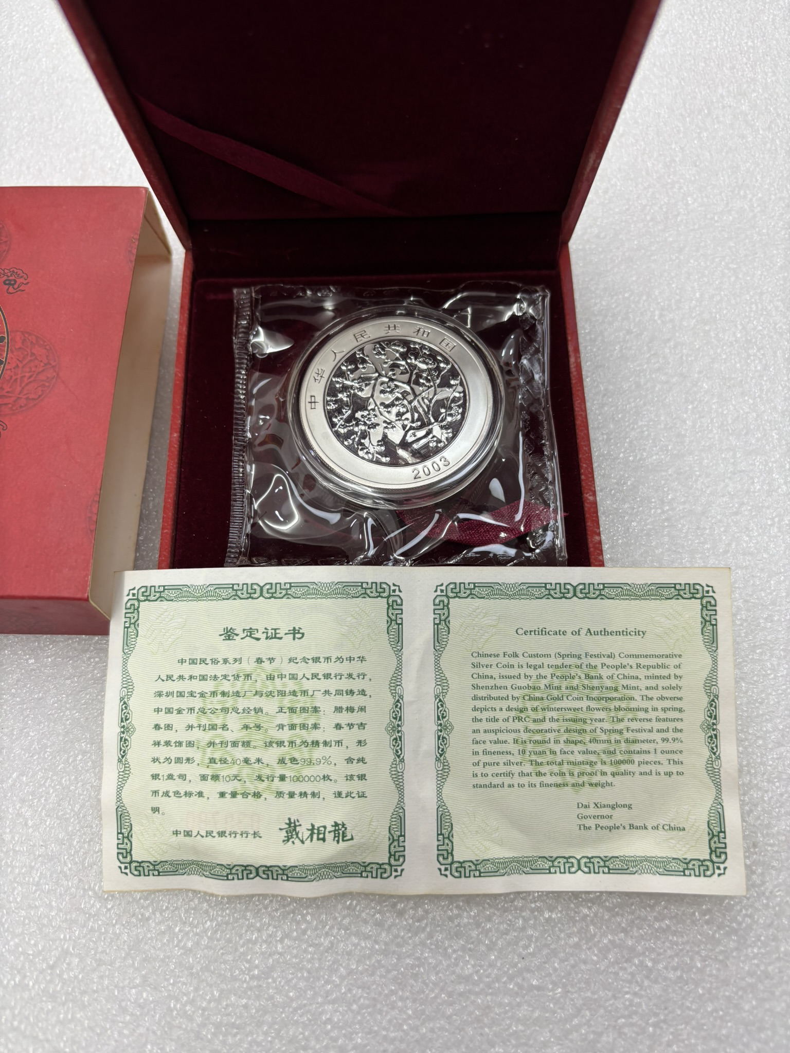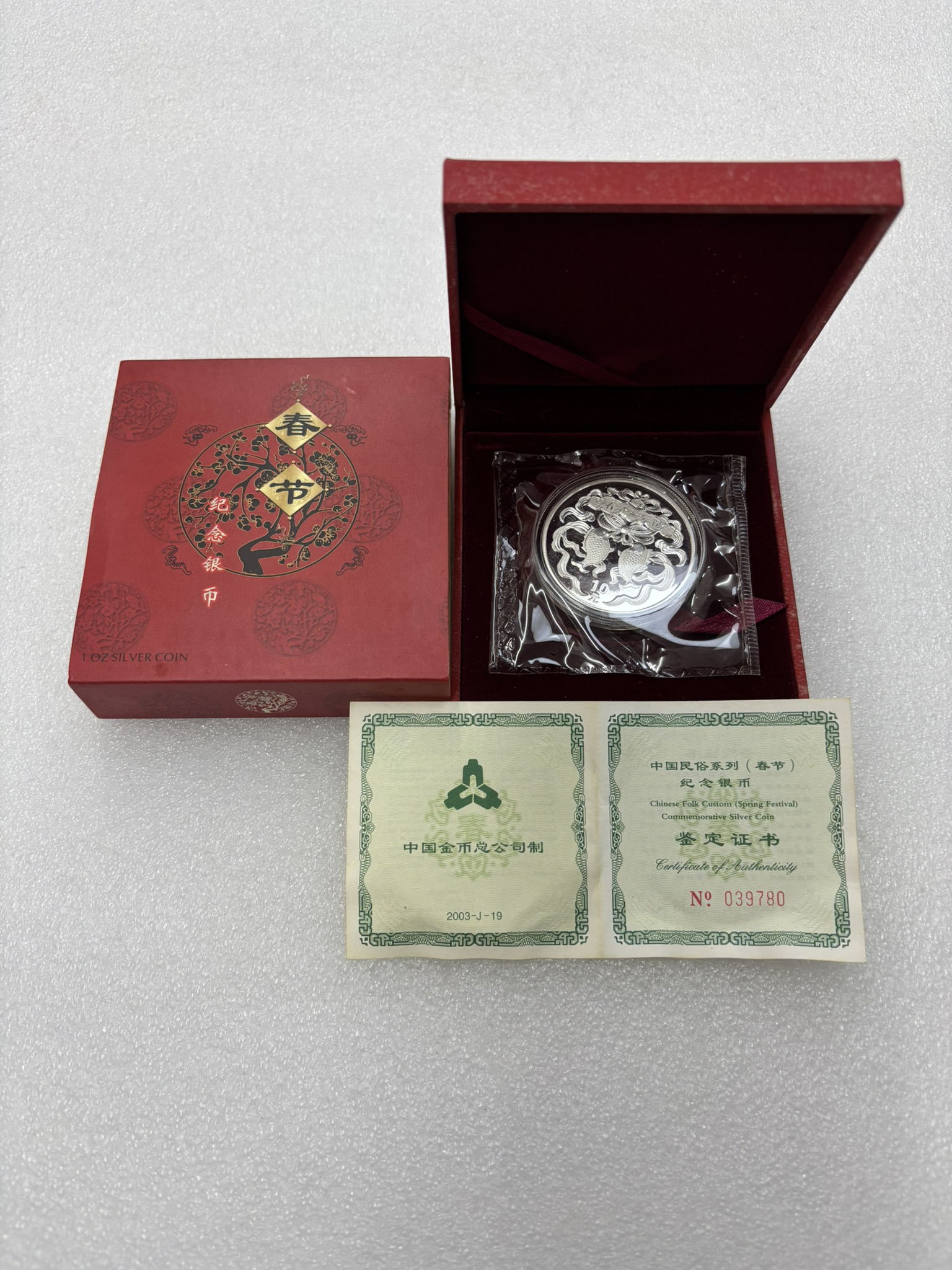 2003年春节1盎司银币1枚,原封带原盒证书,价格450元