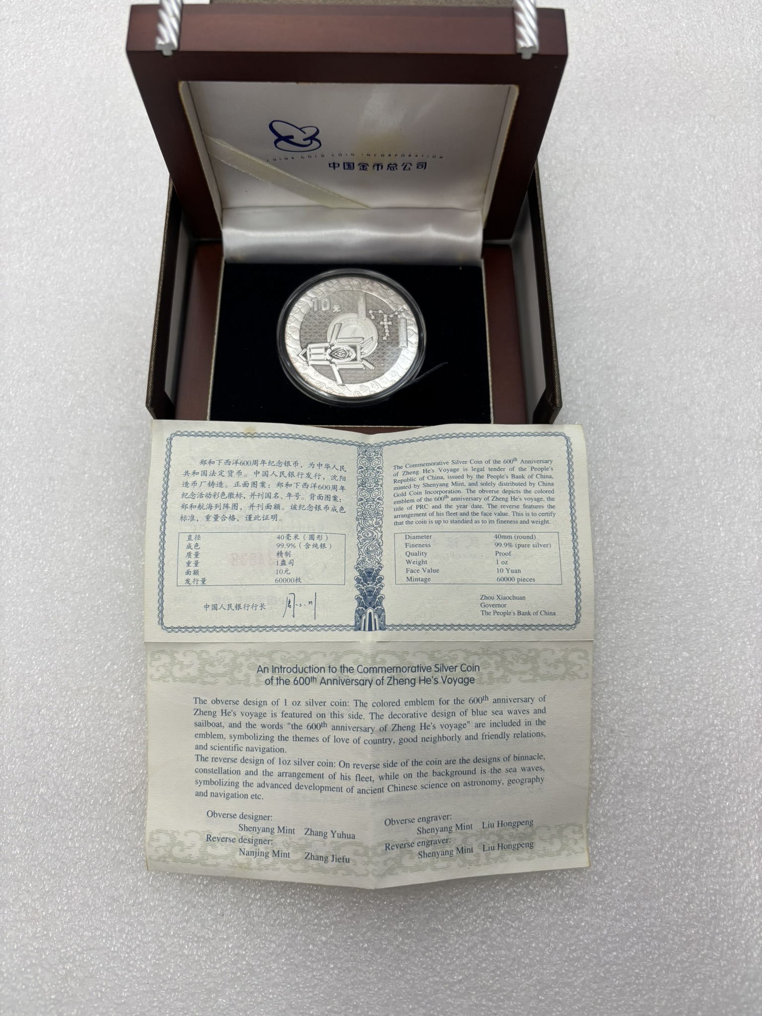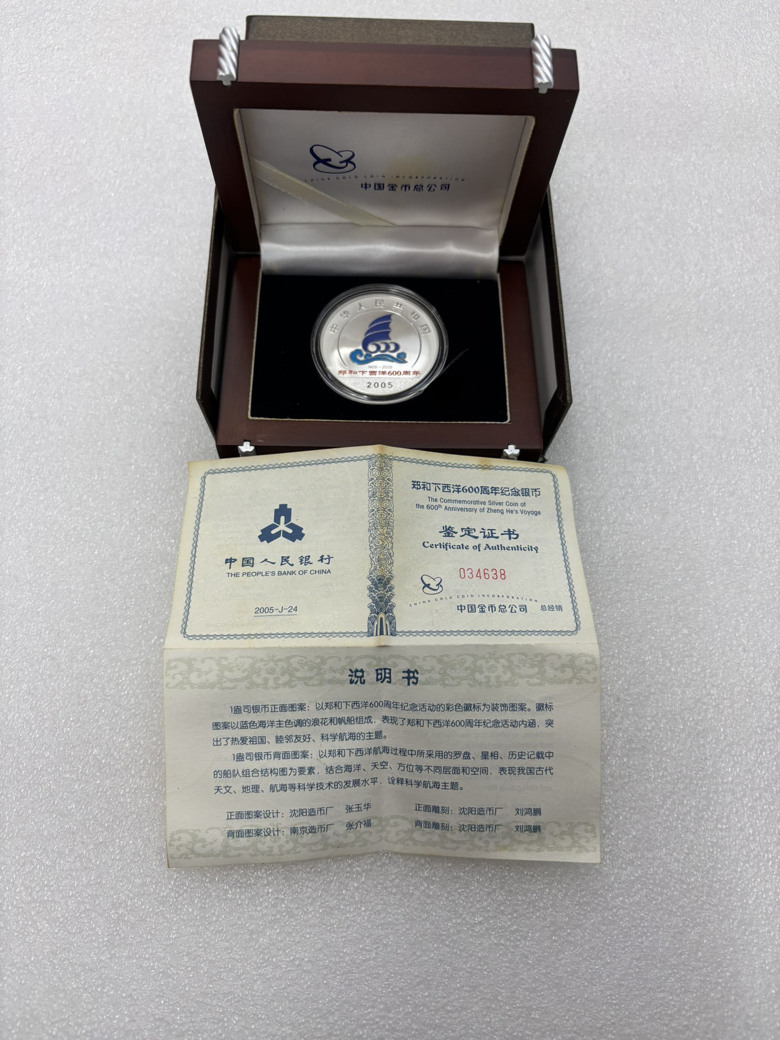 2005年郑和1盎司彩银币1枚,带原盒证书,价格450元