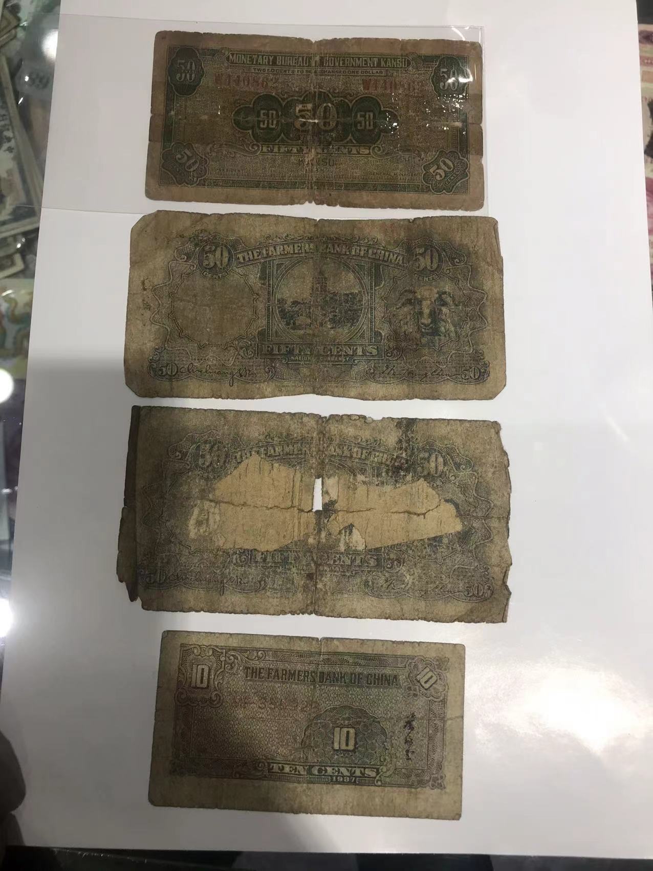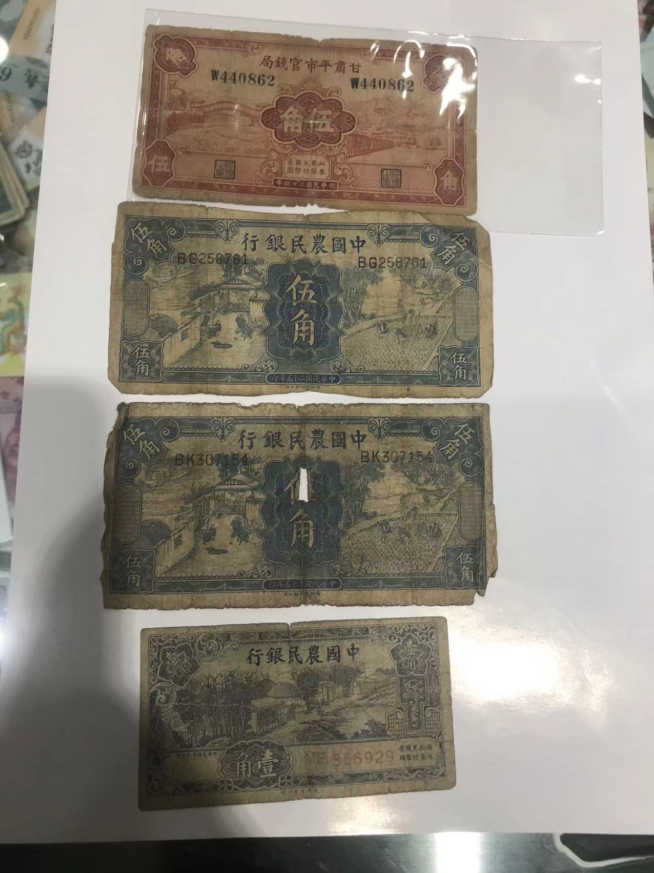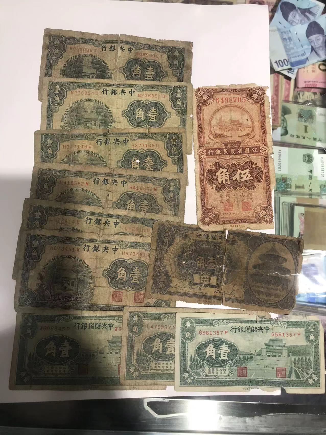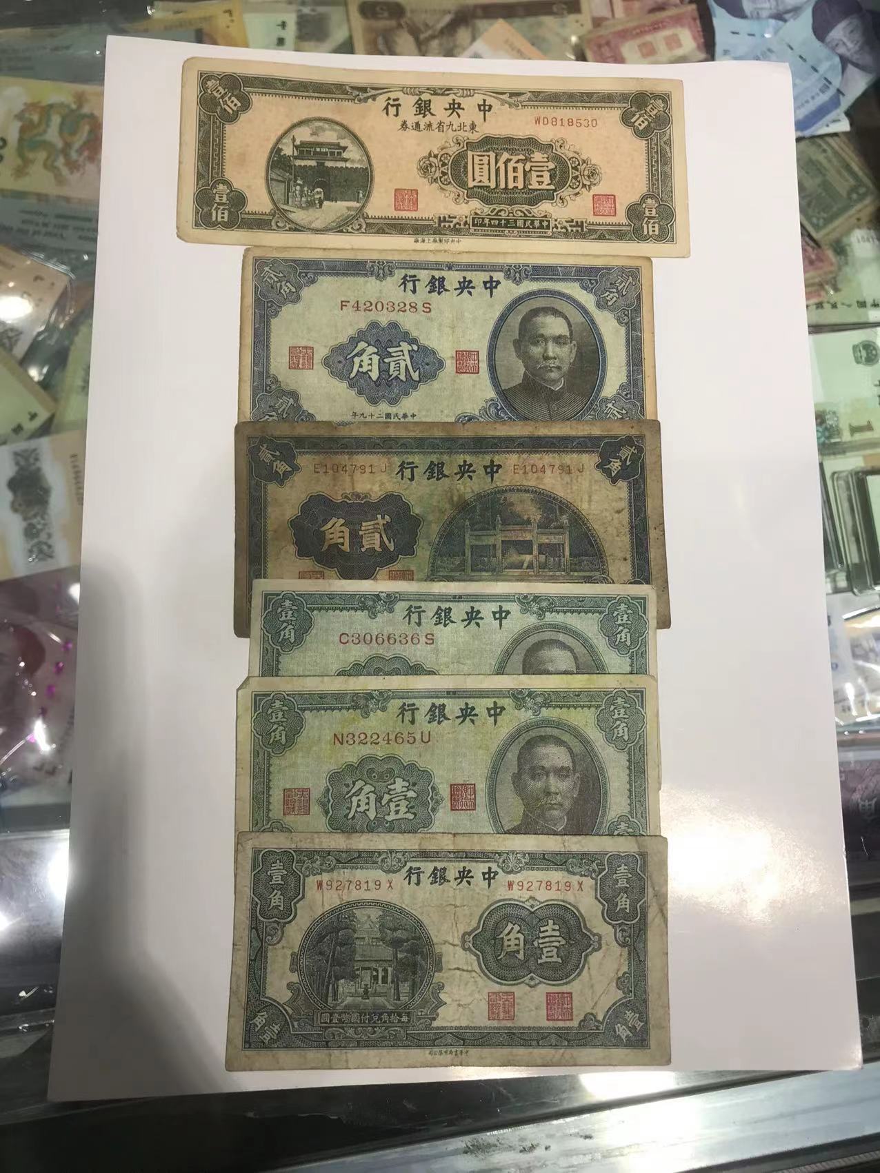 售价:中央银行东九省壹佰元的500元,中央银行贰角每张60元,壹角好品每张50元、旧票每张30元,甘肃平市局伍角200元,中国农民银行伍角、壹角每张50元,江苏农民银行伍角30元,中央银行关金壹百元每张60元,电话联系确认。