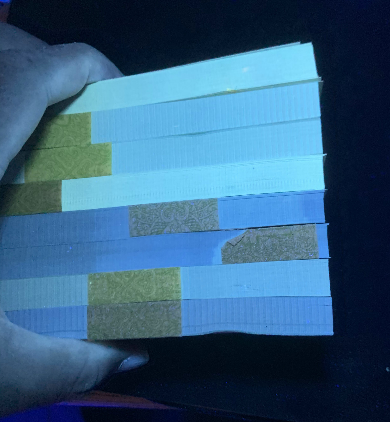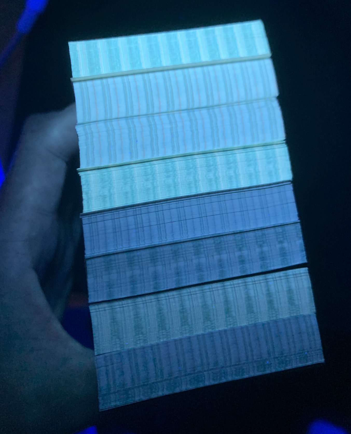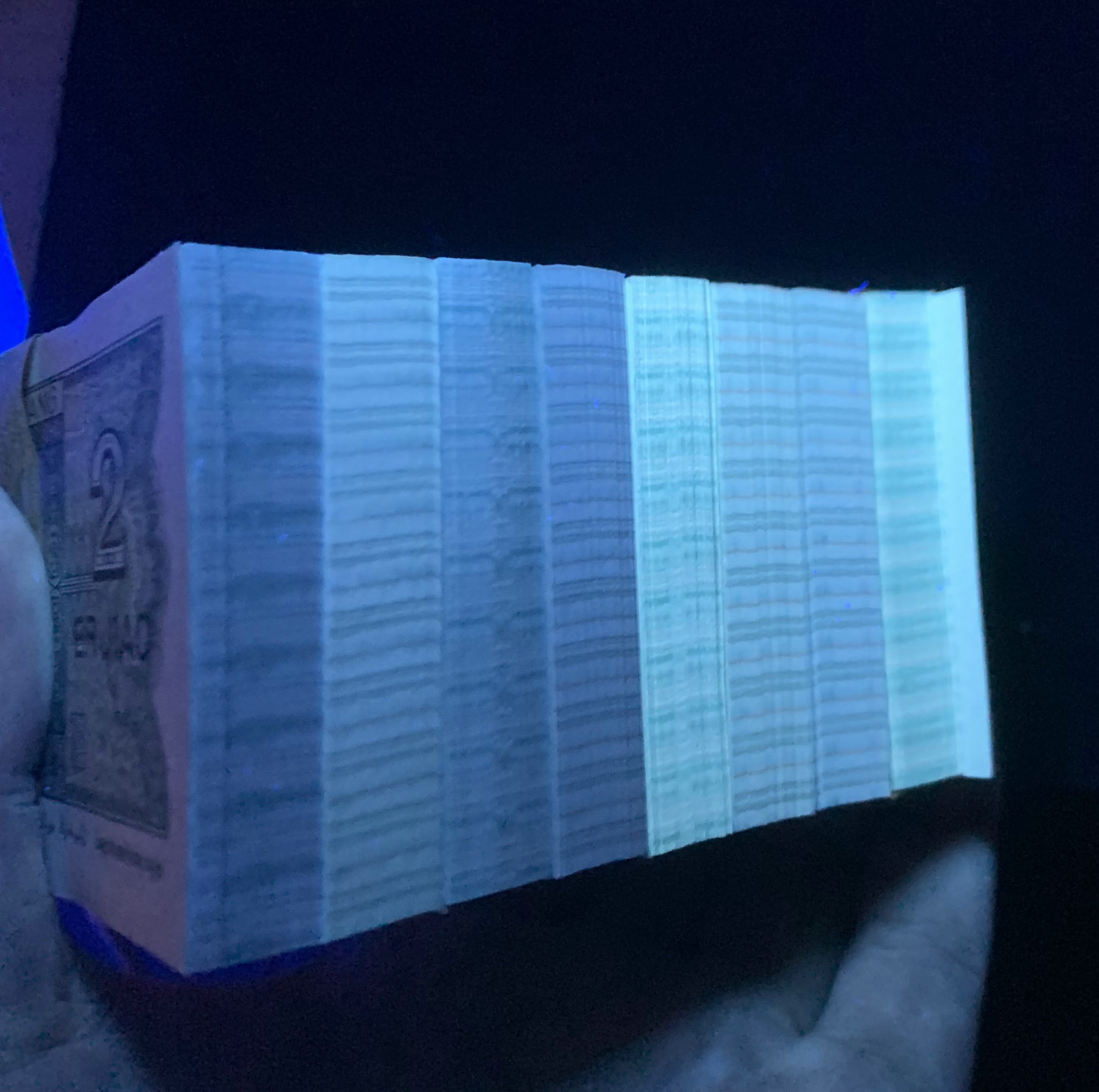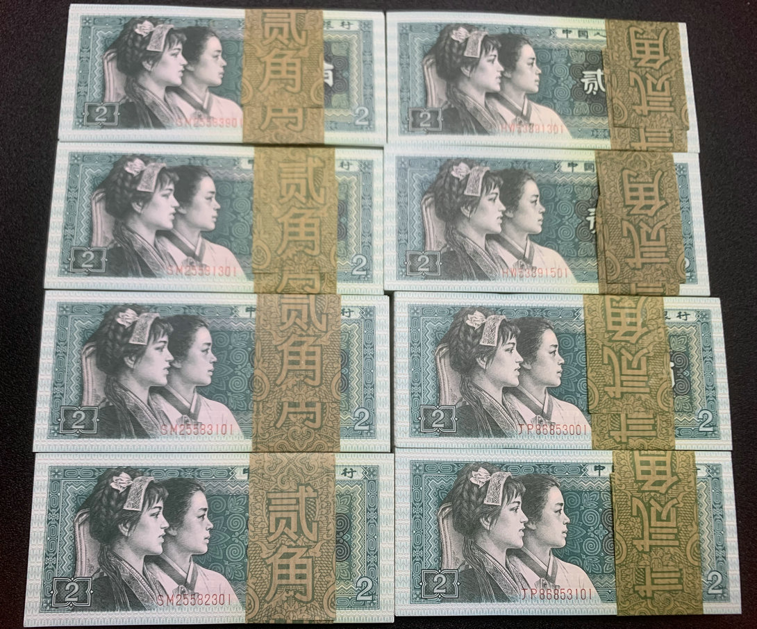 8002捆拆百连刀8刀,其中青绿美翠4刀,北方票,灯下无斑,有两刀沾了杂,都是无47的,通走325元一刀