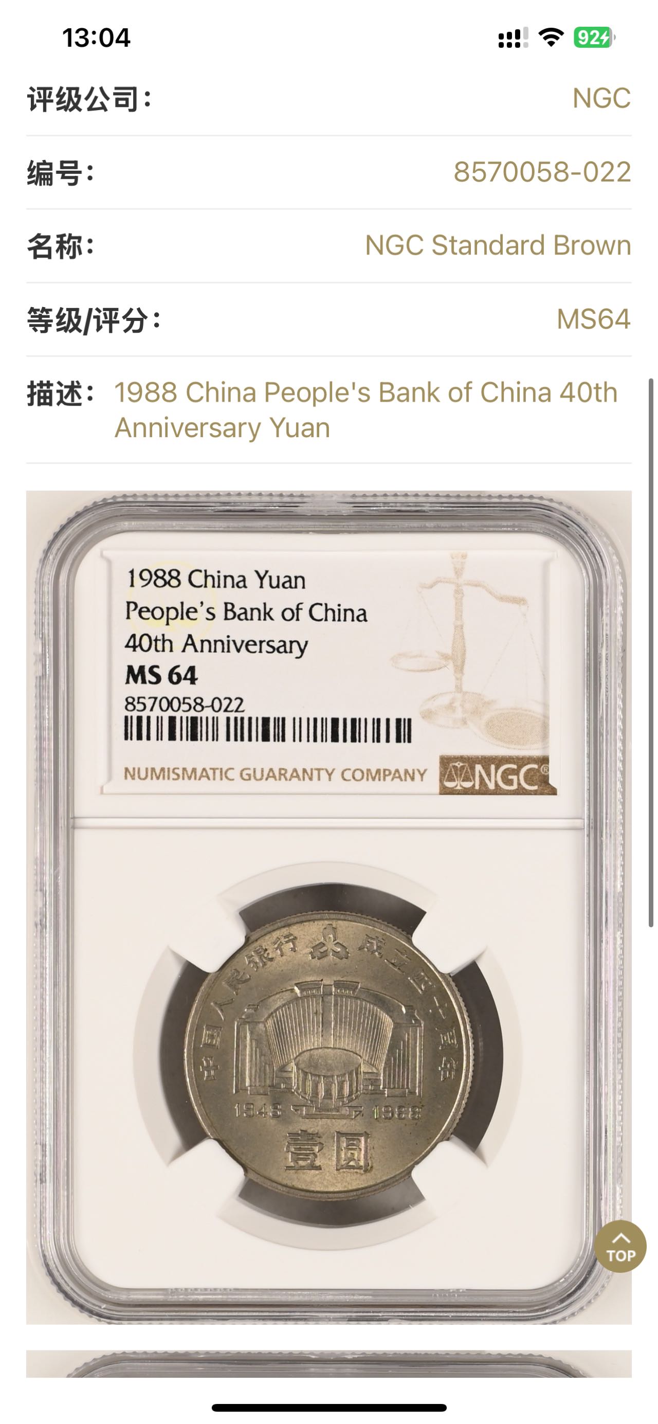 1850元出 币王 1988年 建行四十周年 纪念币