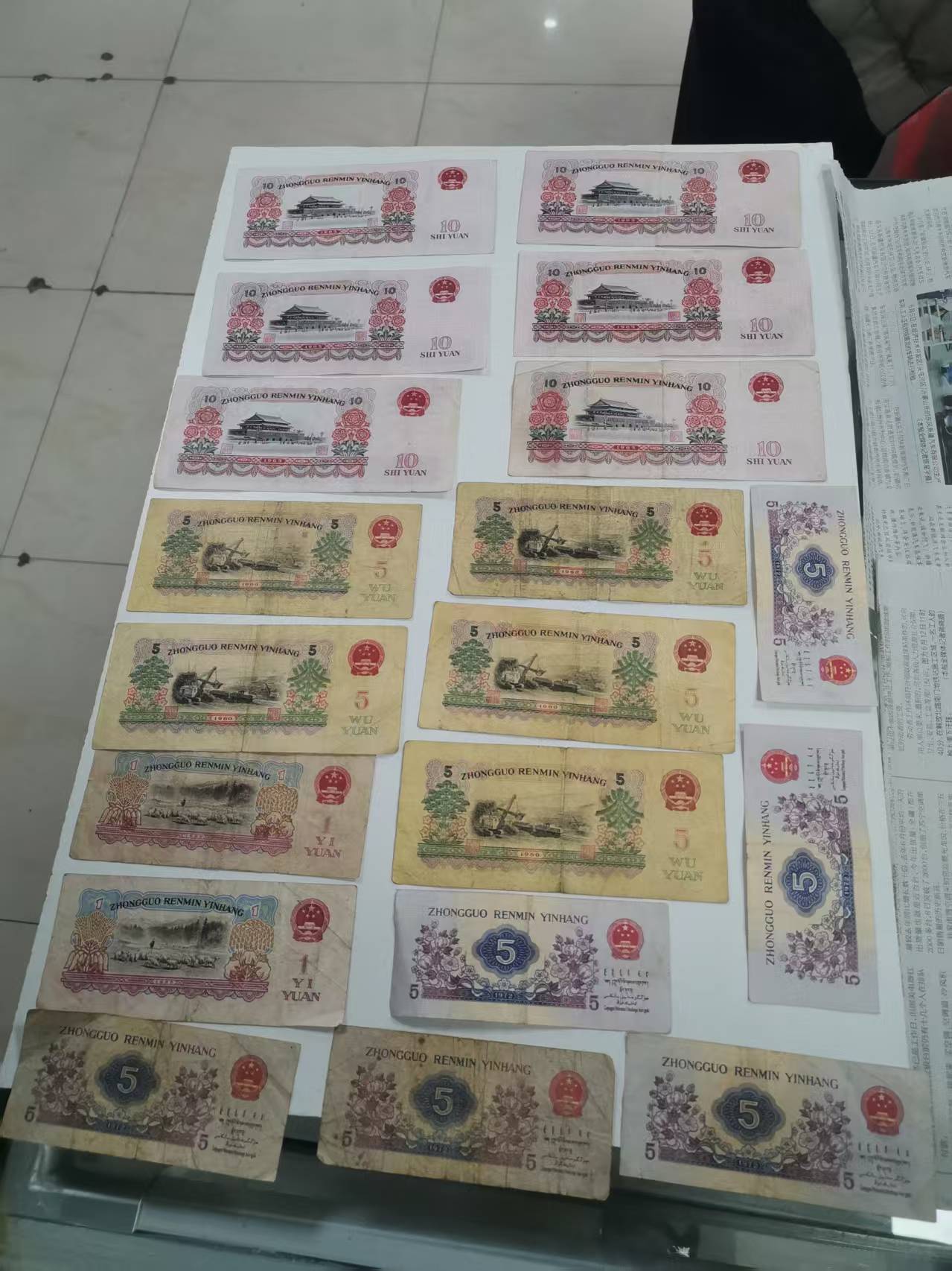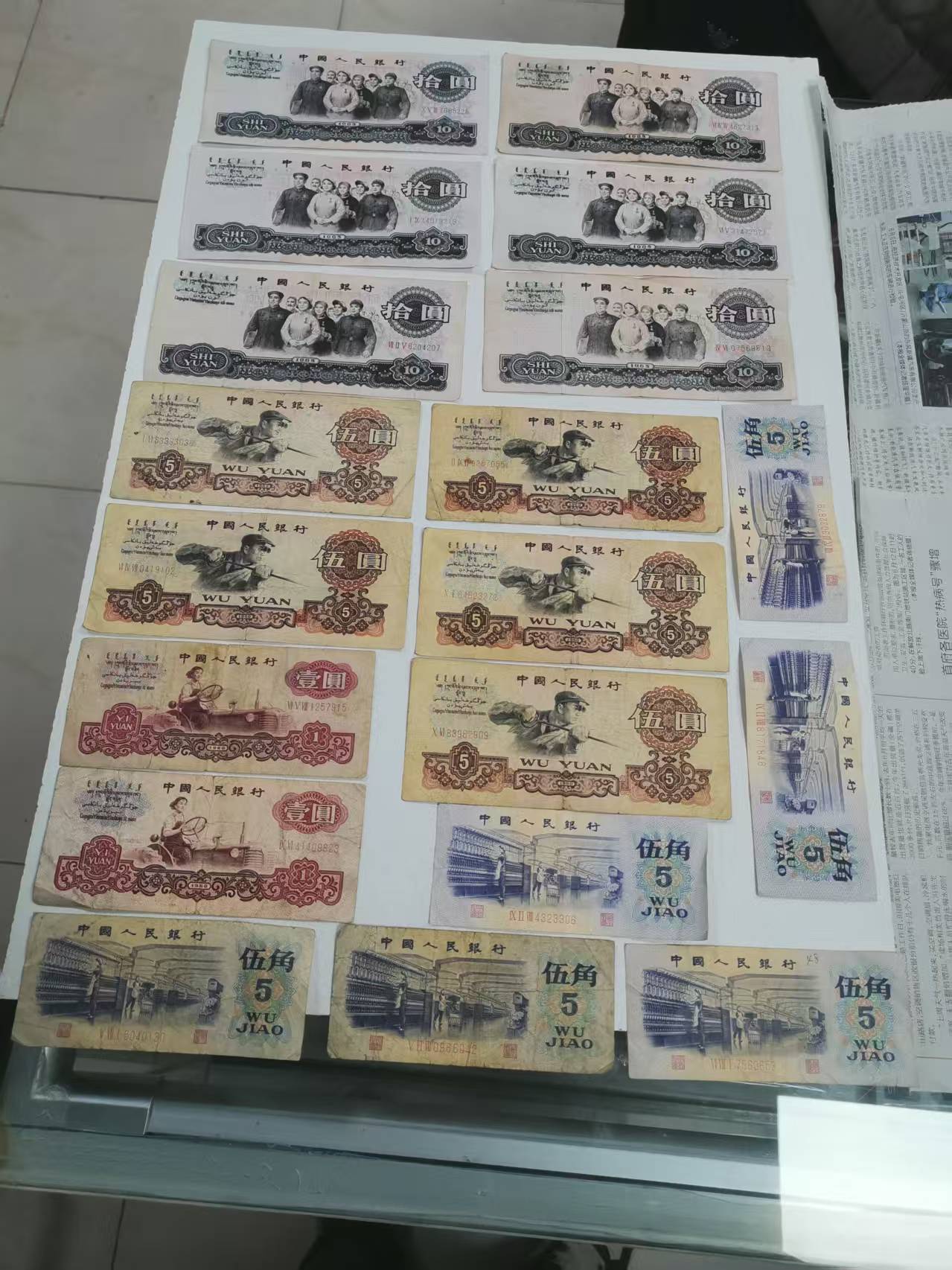原票各几张,大团结6张300元,炼钢5张325元,拖拉机两张一起25元,5角6张140元,