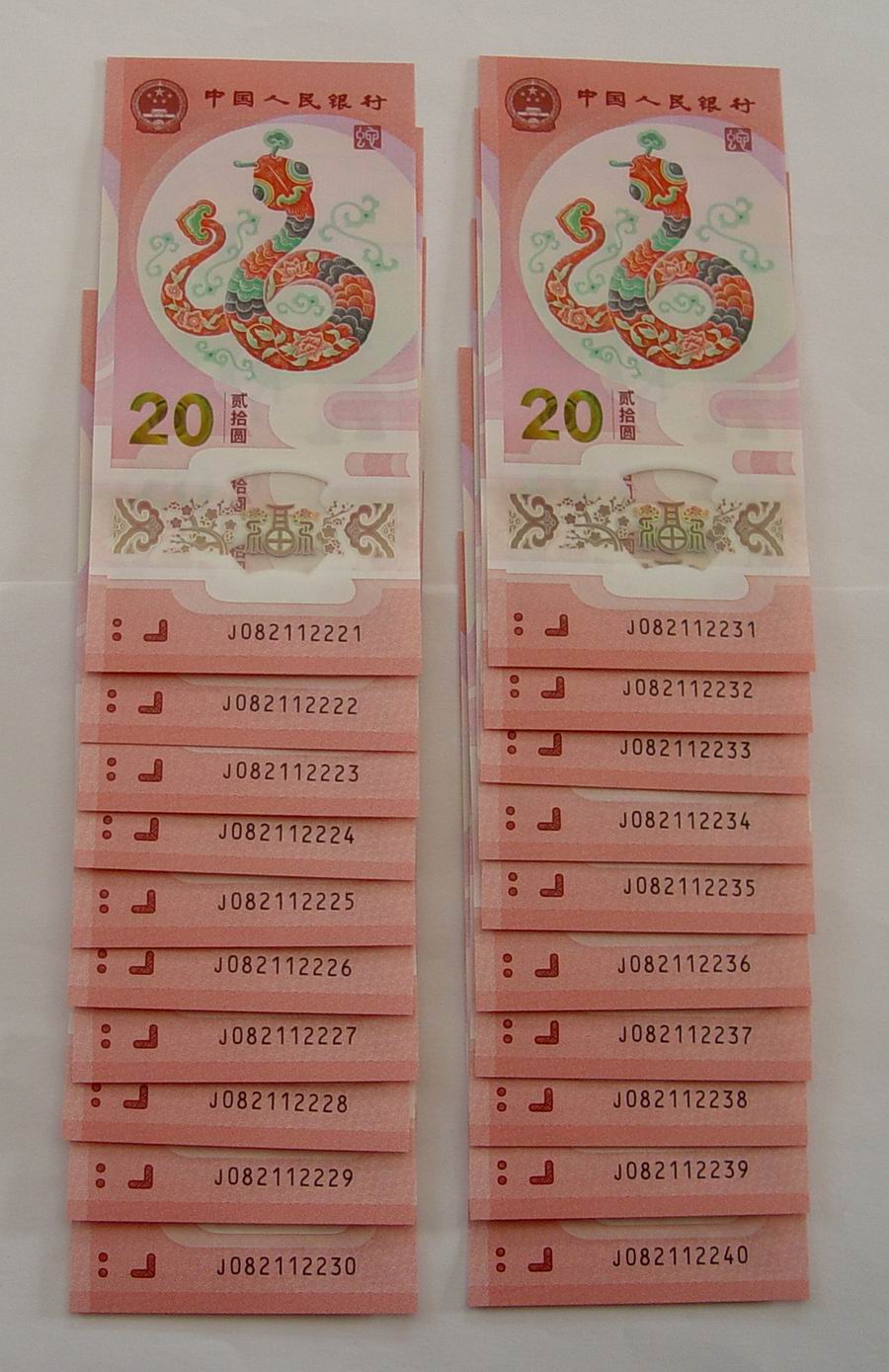 出售蛇钞0128组合朦胧20连号,一手货,品相无瑕疵,售价:6000元,包顺丰。