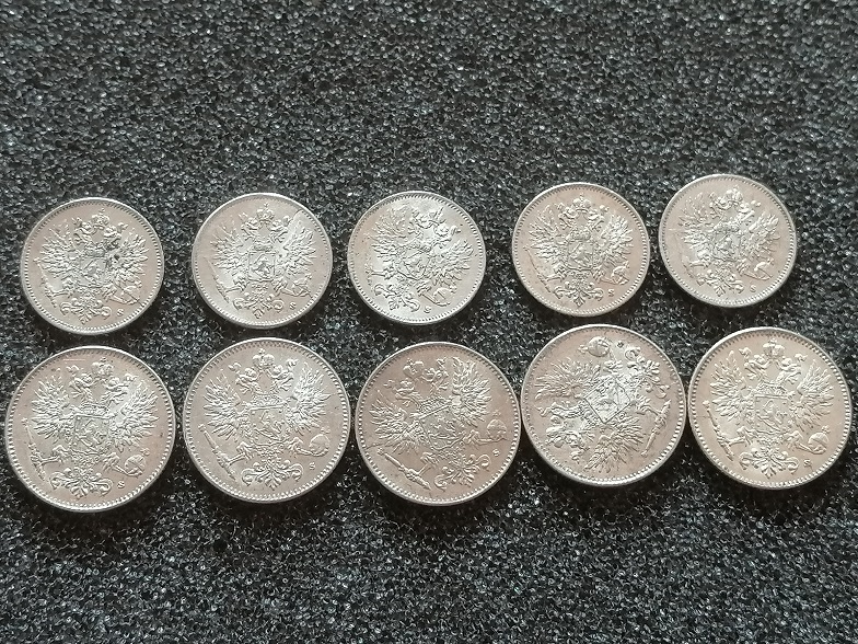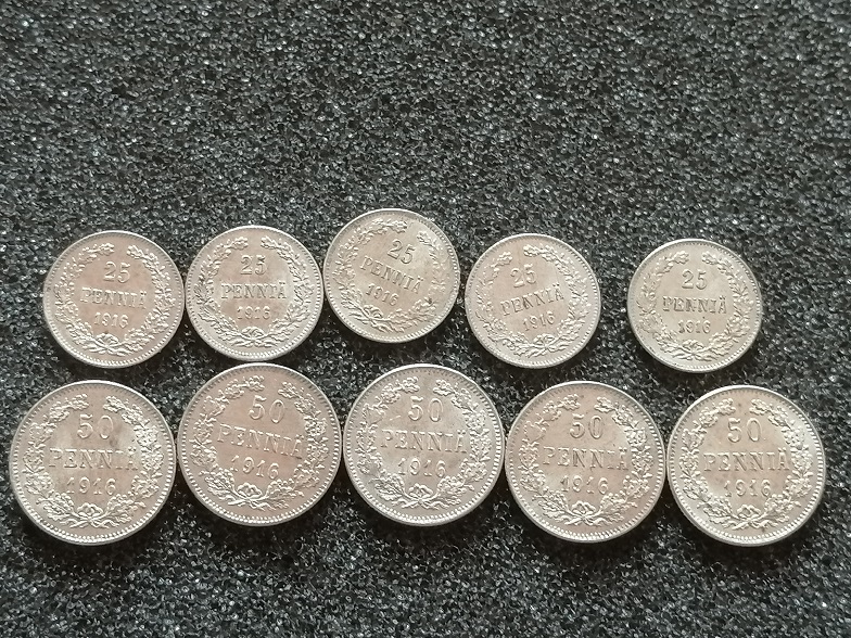 美品带光1916年俄占芬兰50芬尼银币、25芬尼银币5对;10枚齐售不分拆300元包普快!
