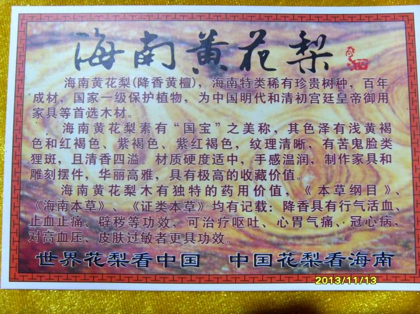 问题三:海黄的味道不是很清香的降香味吗?怎么闻到的是酸味甚至没有味道!答:是的,是黄花梨都具有降香黄檀这个树种独特的香味,然而,大家能接触到的海黄香味却有许多的“变味”,有的甚至是臭味,这就要求大家走出光靠味道辨别海黄越黄的误区。海南黄花梨要看生长环境,像生长在潮湿的地方,木质本身密度达不到的话就会有酸味。海黄的降香味一般只有新切面或者封严的杯子罐子才好闻到,一旦新切面暴露在空气中,不久香味就慢慢淡去,直到刮开新的表面就又会散发出来。因此,每一位新的玩家不要以为你的宝贝闻不到香味了就开始怀疑它不是否真正的海南黄花梨,因为要辨别,海黄的花纹是最主要的因素之一。
