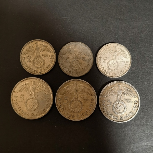 兴登堡2马克银币3枚,60元/枚,一起出;兴登堡5马克银币3枚,130元/枚,一起出.