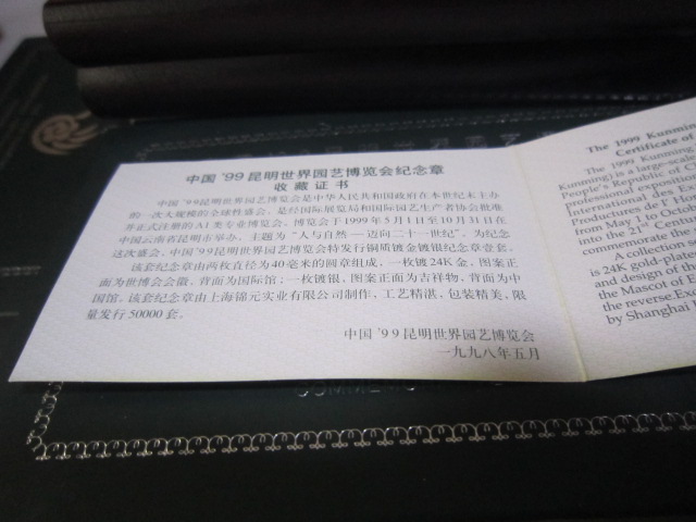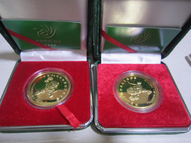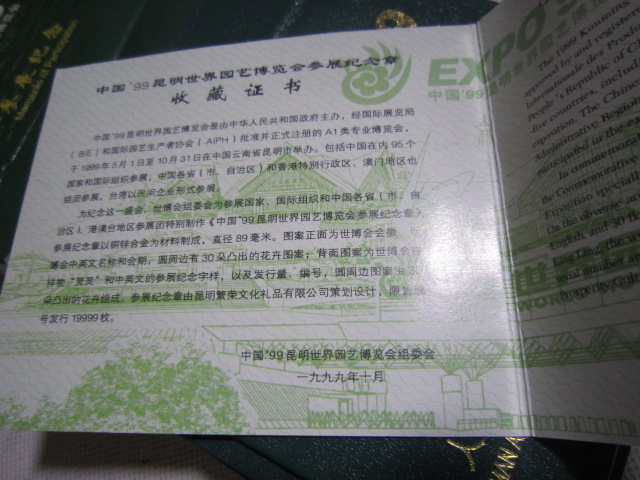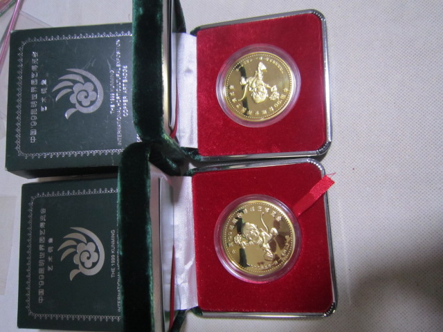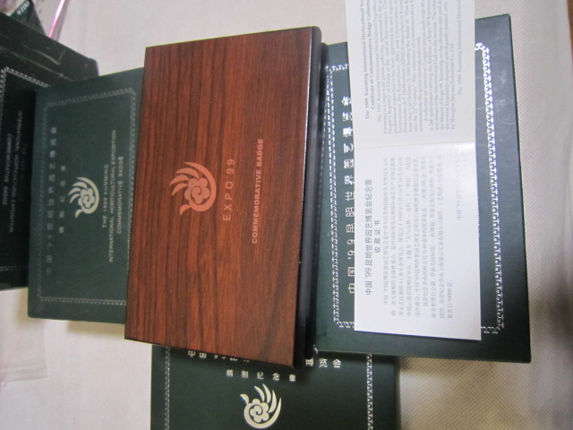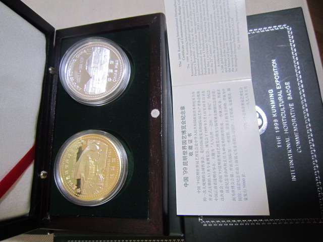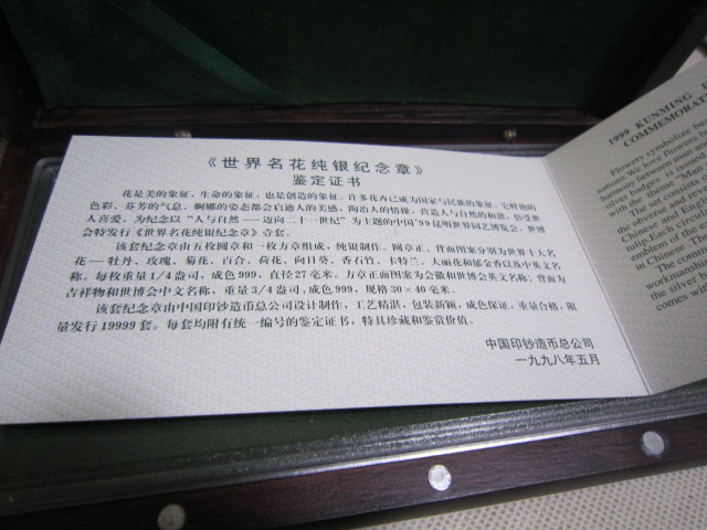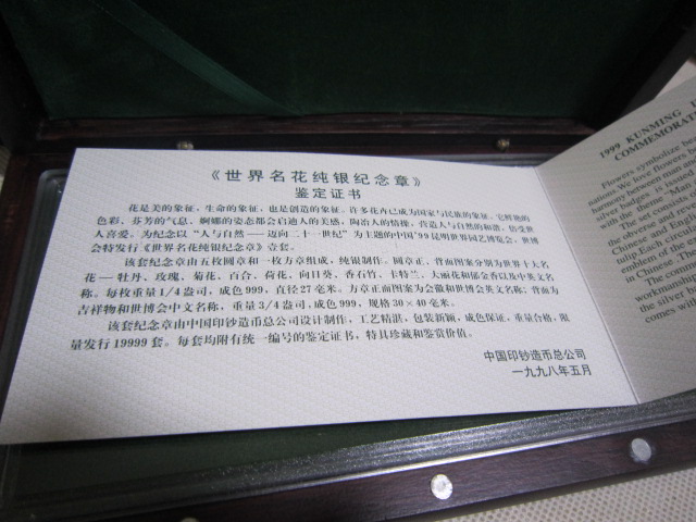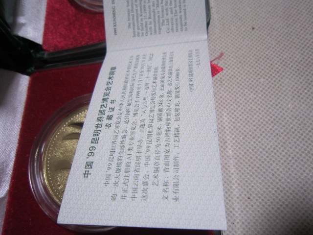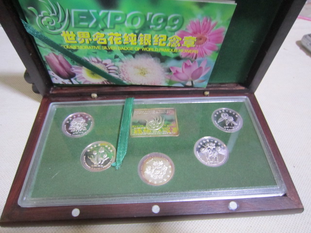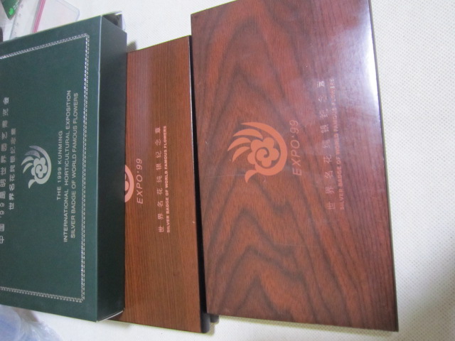 基本都是全新,少部分最外纸盒有点脱胶。1精制铜镀金,银纪念章有8盒。4厘米一对,60元一盒,2盒起售,一起包邮。2,5厘米,铜镀金,单枚48元一盒,2盒一起出售96元,3双色大章,8.9厘米,售价150元,4,世界名花纯银章,一盒5枚,重2盎司,62克多。718一盒两盒一起出售1436,基本银价。5,99世博纯银纪念册,20克,只有一册售价218包邮。直接确认或联系确认,也可加签名栏微信尾55558交易