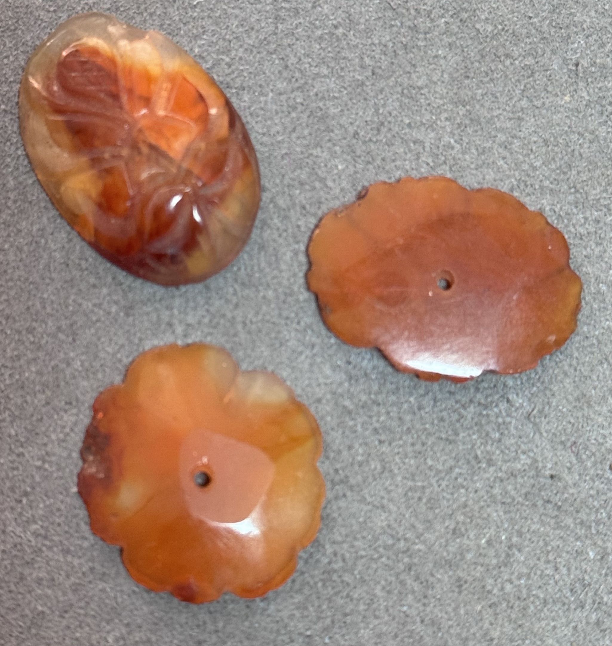 → 老玛瑙帽花 柿子红色 三个一组 表面光滑有光泽 颜色均匀漂亮 一个梅花形 两个花瓣形 适合做配饰或收藏