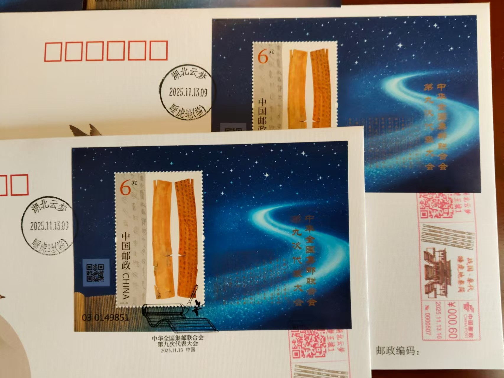 九邮小型张2枚。再加九邮总公司首日封,加盖云梦睡虎地邮戳和邮资机戳,共2个封。一共55元包挂寄。