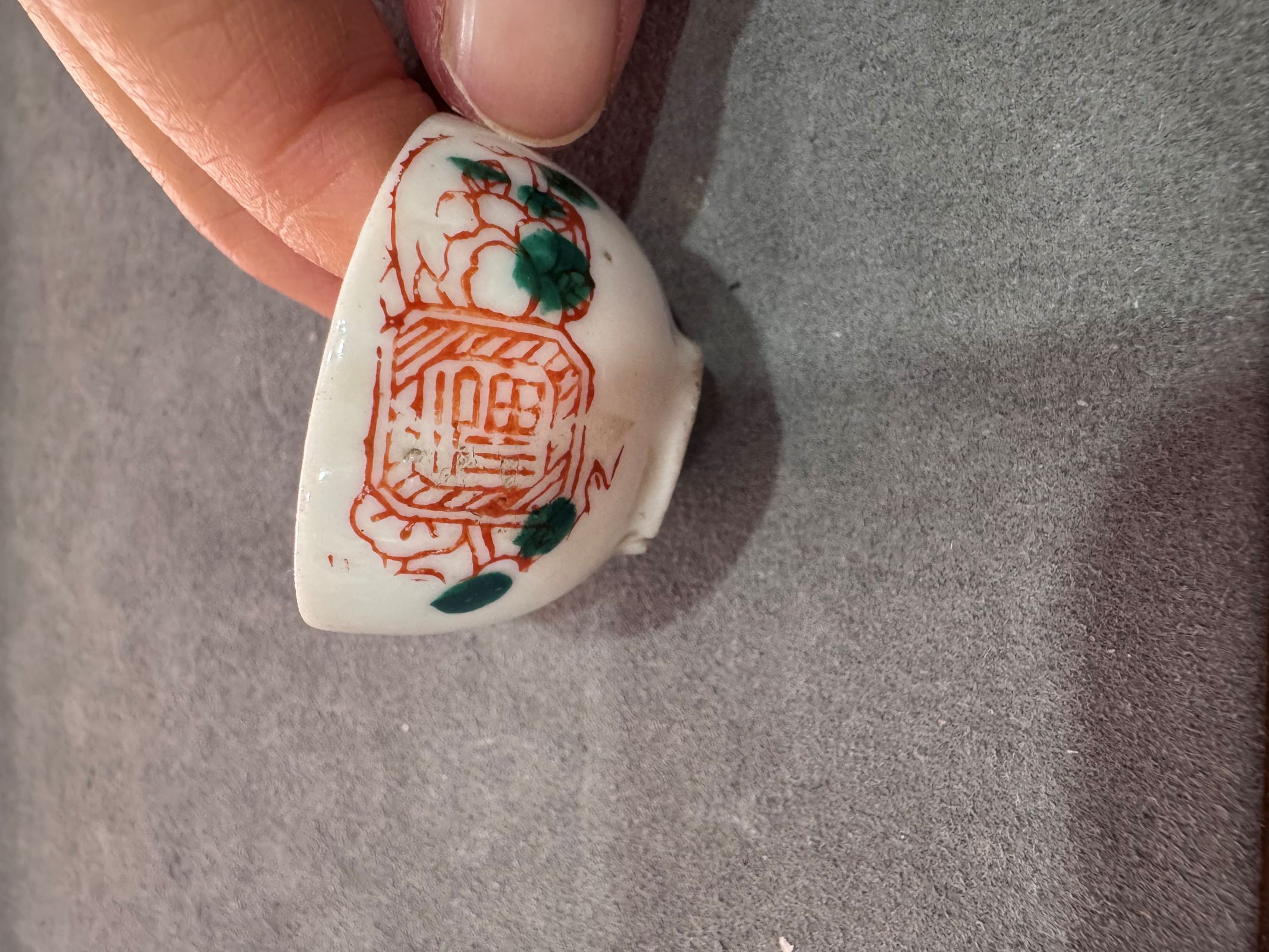 → 民国福字粉彩小酒杯,白瓷胎,釉色莹润。杯身绘制红色福字纹饰,配以绿叶点缀,造型小巧精致。杯身完整,胎质细腻,适合收藏把玩。品相如图,整体造型典雅大方。