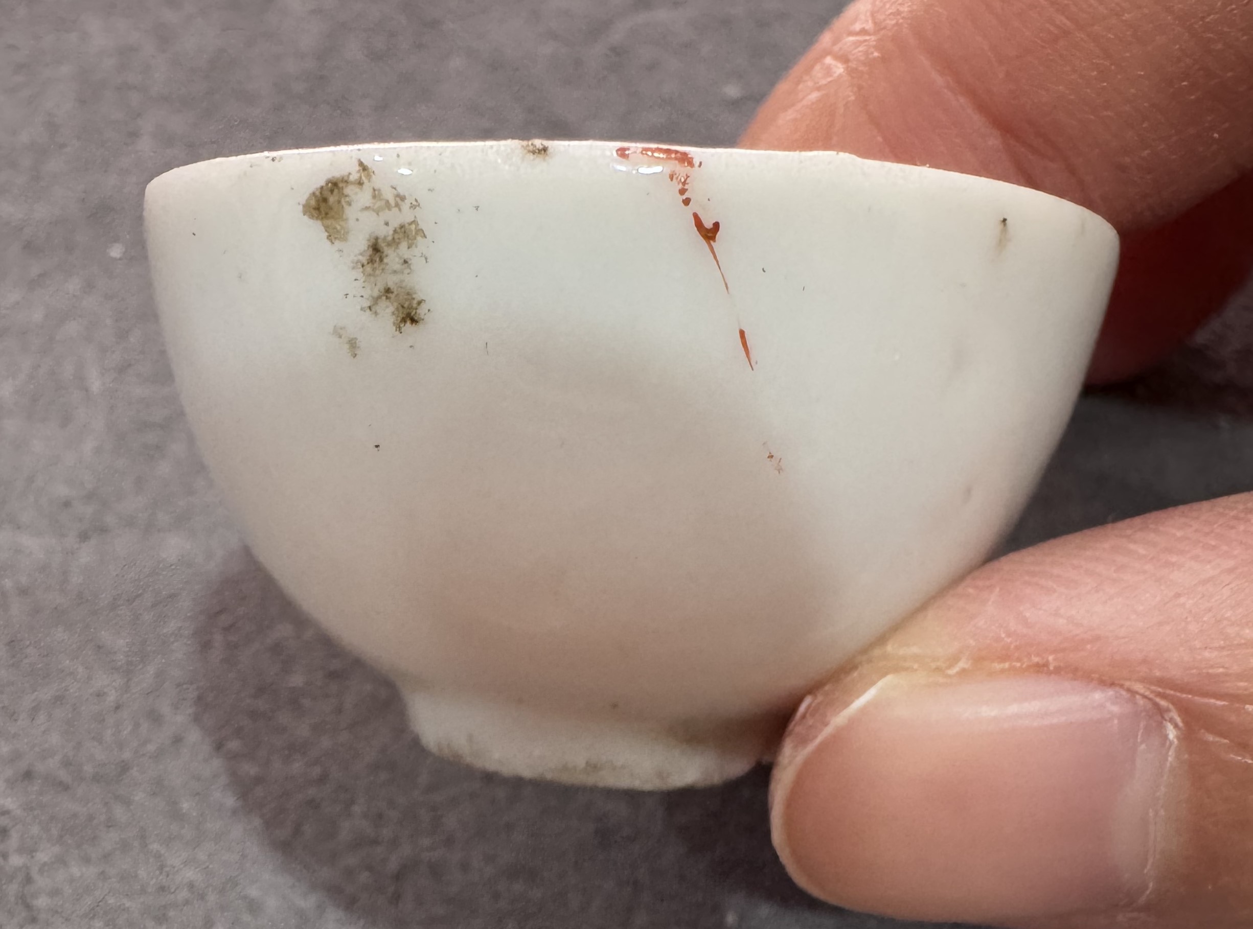 民国福字粉彩小酒杯,白瓷胎,釉色莹润。杯身绘制红色福字纹饰,配以绿叶点缀,造型小巧精致。杯身完整,胎质细腻,适合收藏把玩。品相如图,整体造型典雅大方。