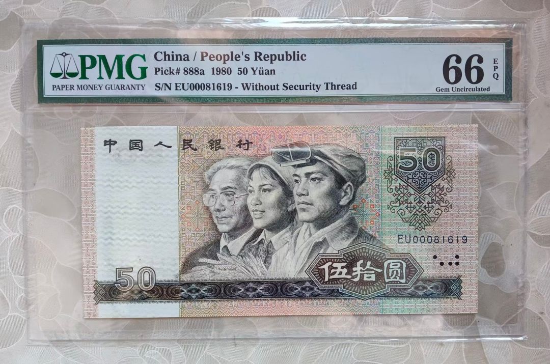 四版币王8050开门小号 倒置号PMG66E,稀冠EU00081619,尺寸足,无斑,售5800元包邮。