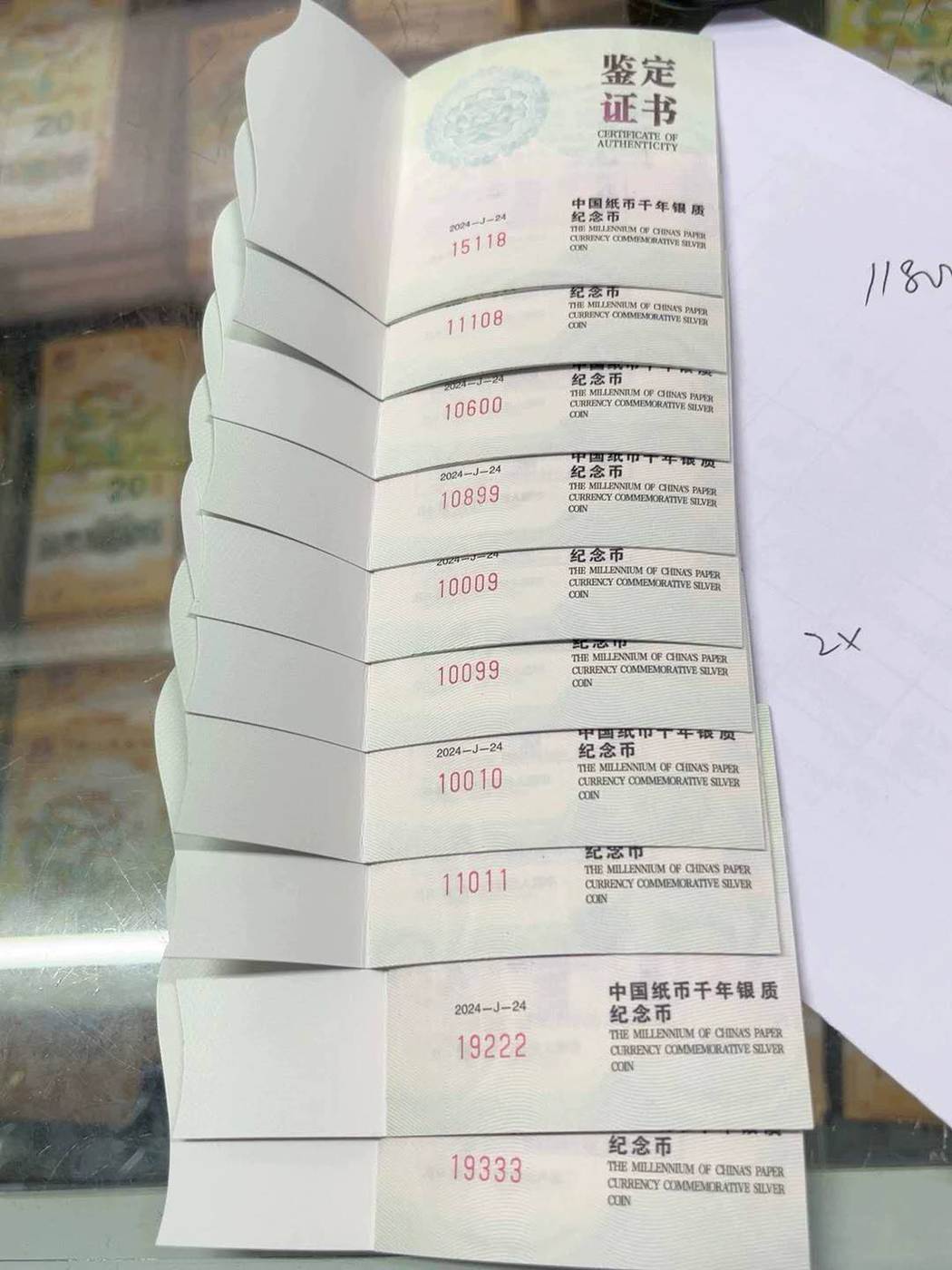 11011售1000元,19222、19333两枚售2400元,其余号售900元一枚,证书配件齐全