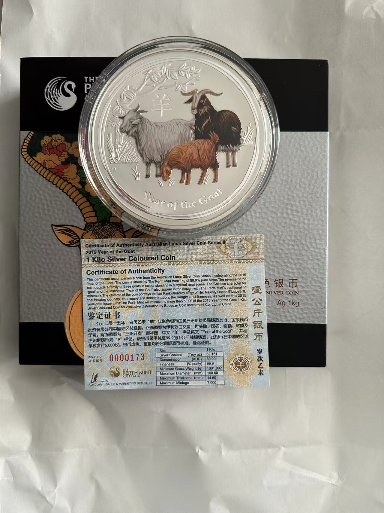 售:2015年澳大利亚公斤羊彩银币,一枚,盒证完好,品如图,12600元,三包。