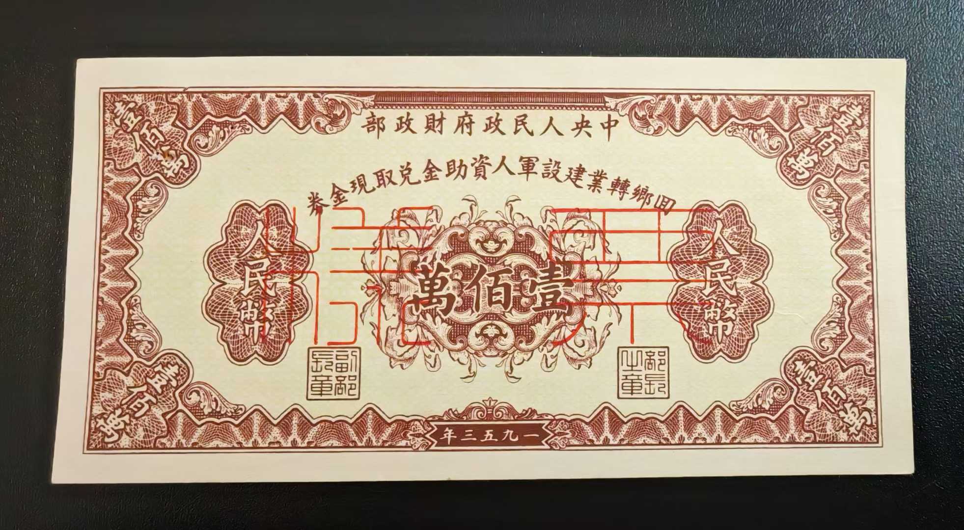 → 非常稀少:1953年中国人民政府财政部回乡转业建设军人生产资助金兑换取现金券一百万样票