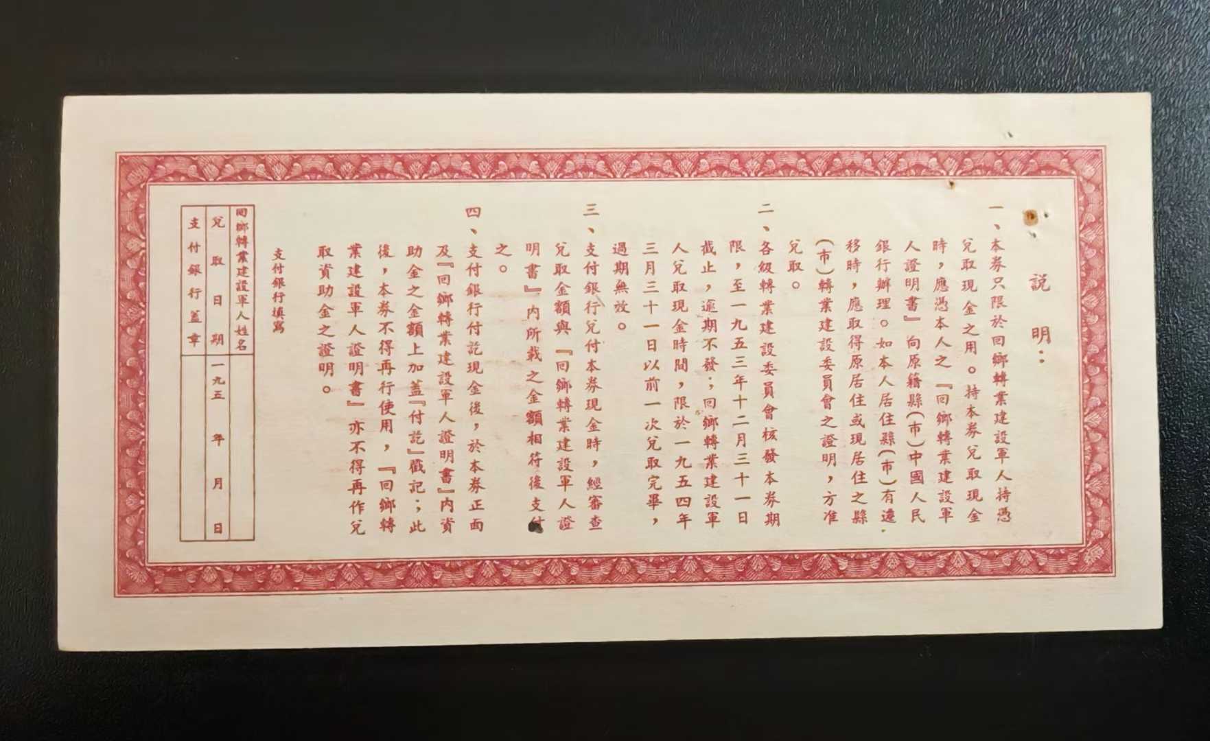 非常稀少:1953年中国人民政府财政部回乡转业建设军人生产资助金兑换取现金券一百万样票1180元