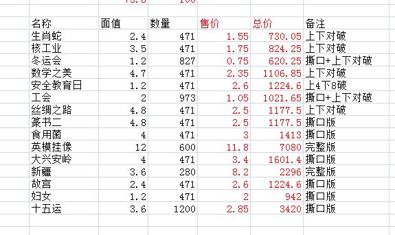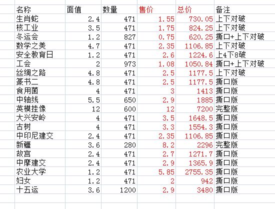确认核工业,数学之美,工会,絲绸之路,篆书(二),食用菌,大兴安岭,各71套,新疆20版。故宫71套,十五运60套。行,明天上午微信转款,不行帮顶!