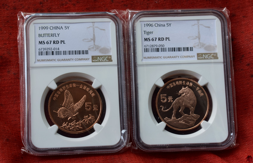 精制珍稀野生动物 裼马鸡 杨子鳄 金斑蝶 华南虎(NGC MS67PL)盒子完好无裂