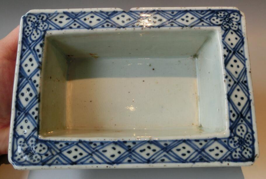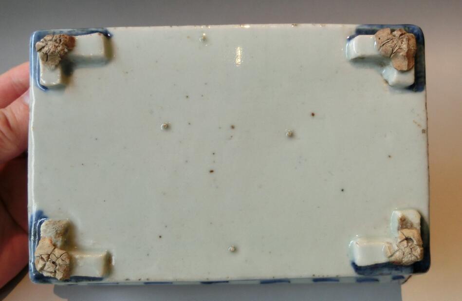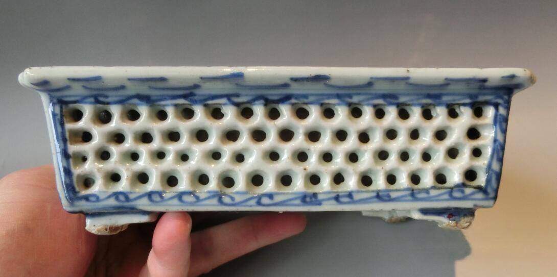 多子多福、双层镂空支钉工艺、清朝青花瓷水仙盆,长17.5厘米、宽11.9厘米、高5.2厘米,经过百年历史年轮磨砺,如图可见,通体宝光如玉,边沿稍有一小磕,其他无任何瑕疵,品质保证,实价1050元。