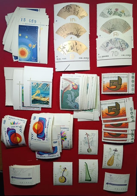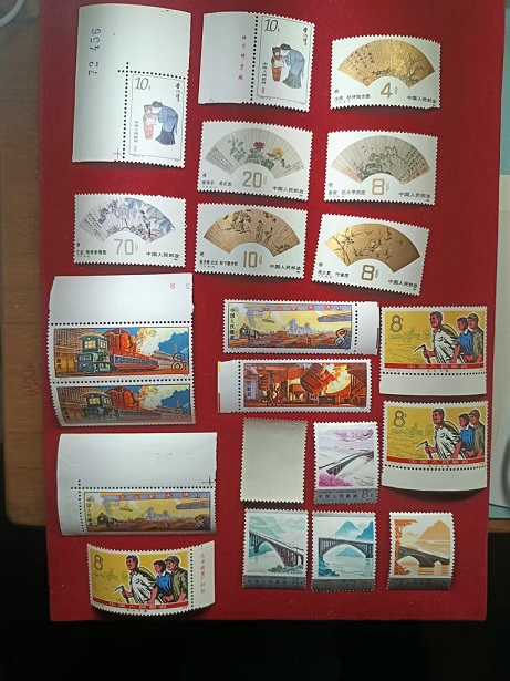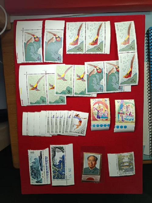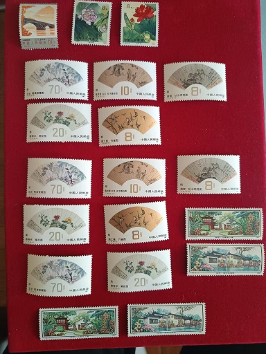 金鸡,原胶近全品,部分有折15一套,共4套。女排原胶全品8分10枚,40元。欢庆原胶近全品金亮色标6元。桂林原胶近全品,20。主席原胶近全品金好8元。拙政园2元。