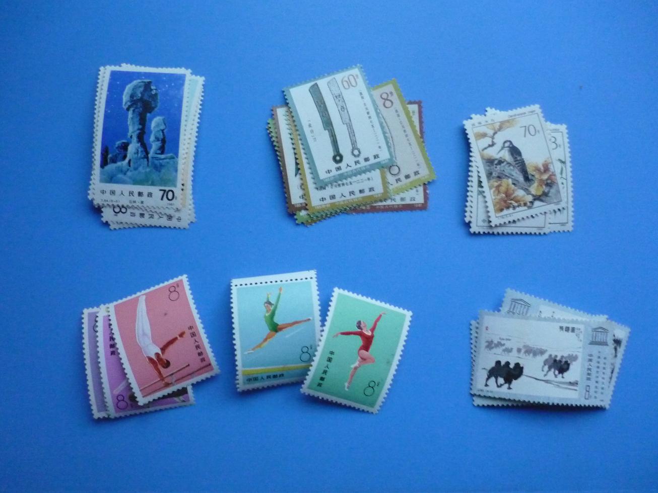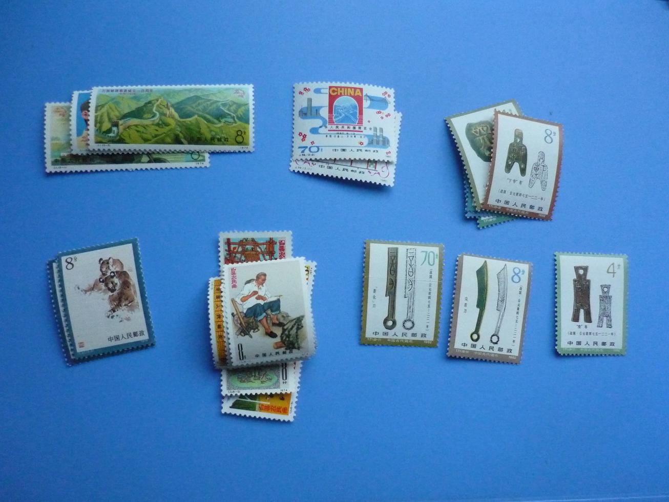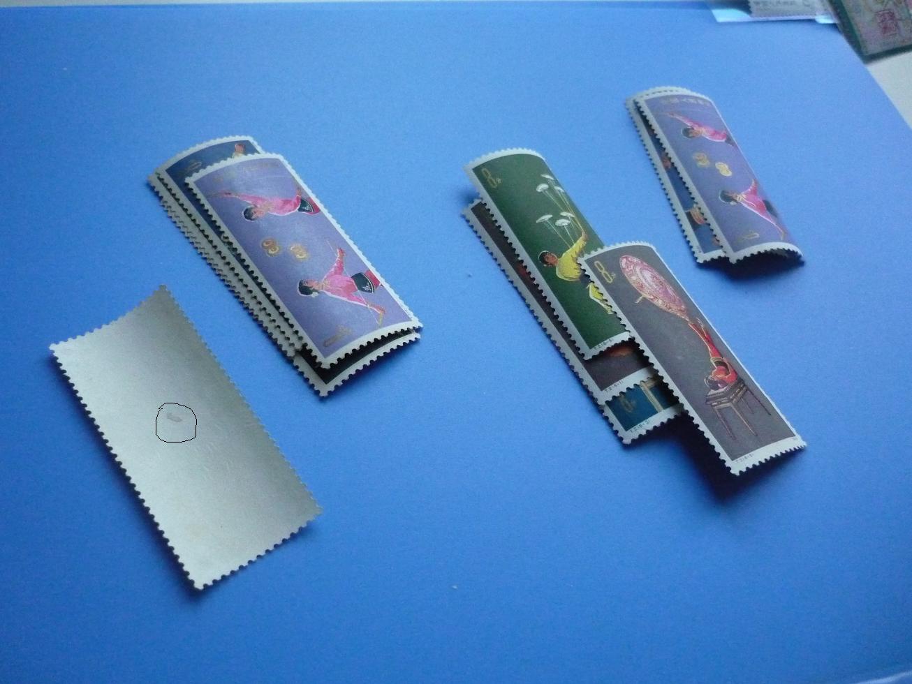 刻舟第一套,第二套本票原胶微黄,两套一起19,刻舟第三套齿间折,票轻微软折,原胶微黄12,三运左面一套原胶微黄金亮,-3背帖75,三运右面一套-5-6-7二胶有折,其余四枚原胶微黄,-3缺角,金亮53,本鸡三枚微黄,右面一枚缺齿,三枚一起55,本狗三枚微黄一起16