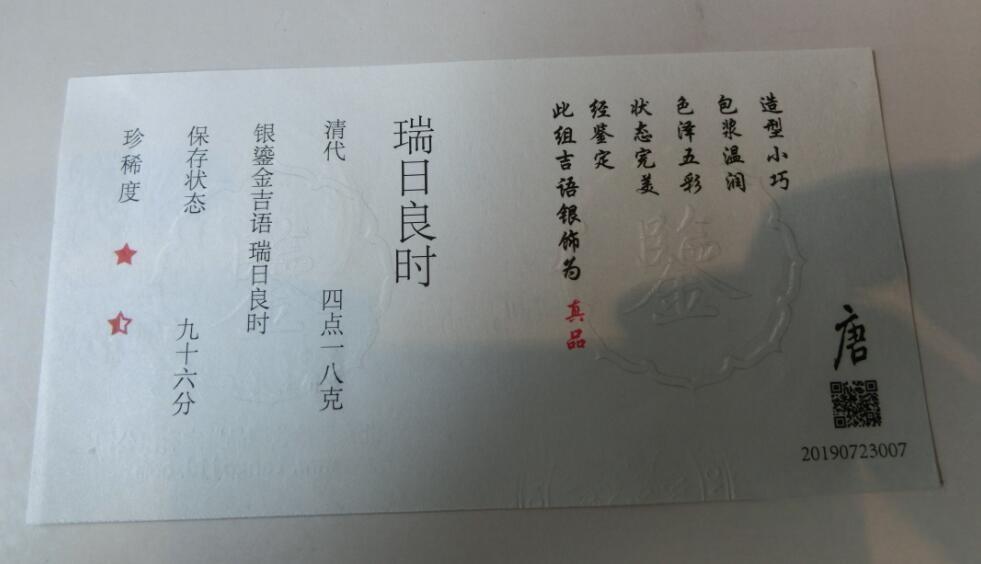 百年历史传承、婚嫁迎娶、清朝银鎏金瑞日良时吉语银饰,已评级鉴定,高分美品,外盒长17.5厘米、宽9.8厘米、高8厘米,古时婚嫁迎娶时的聘礼,很是喜庆,置于案头,细细品味,悠然自得,品质保证,实价550元!~