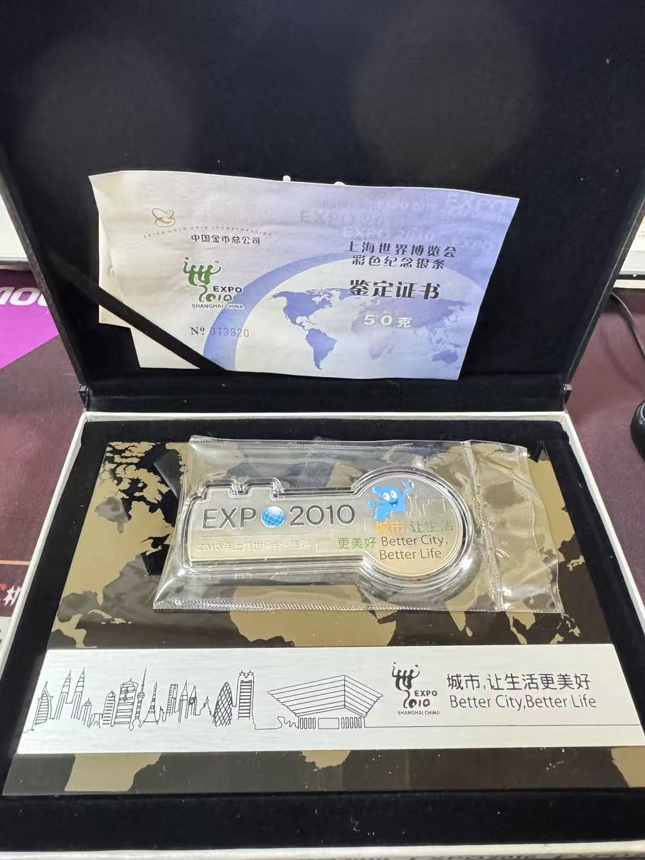 2010年的世博纪念银章。只有2盒一盒是50克的银章。共100克。包装齐全。