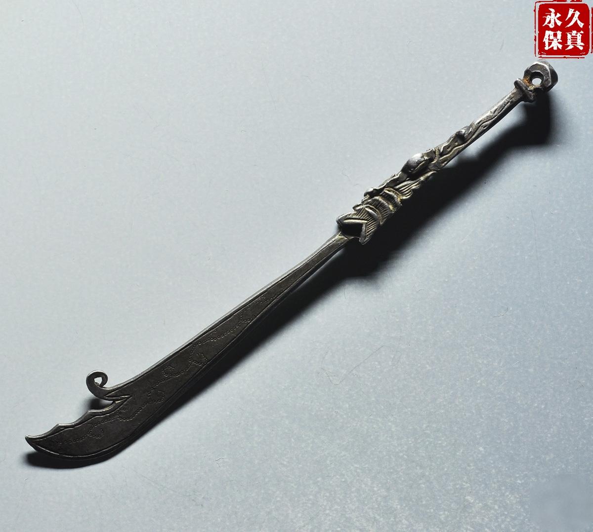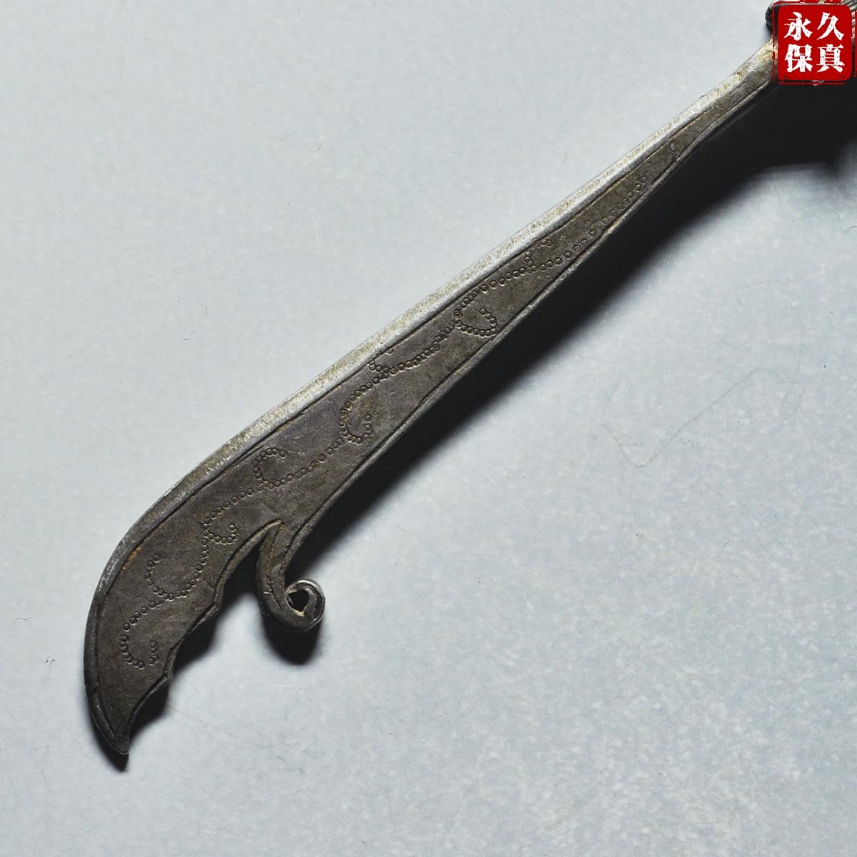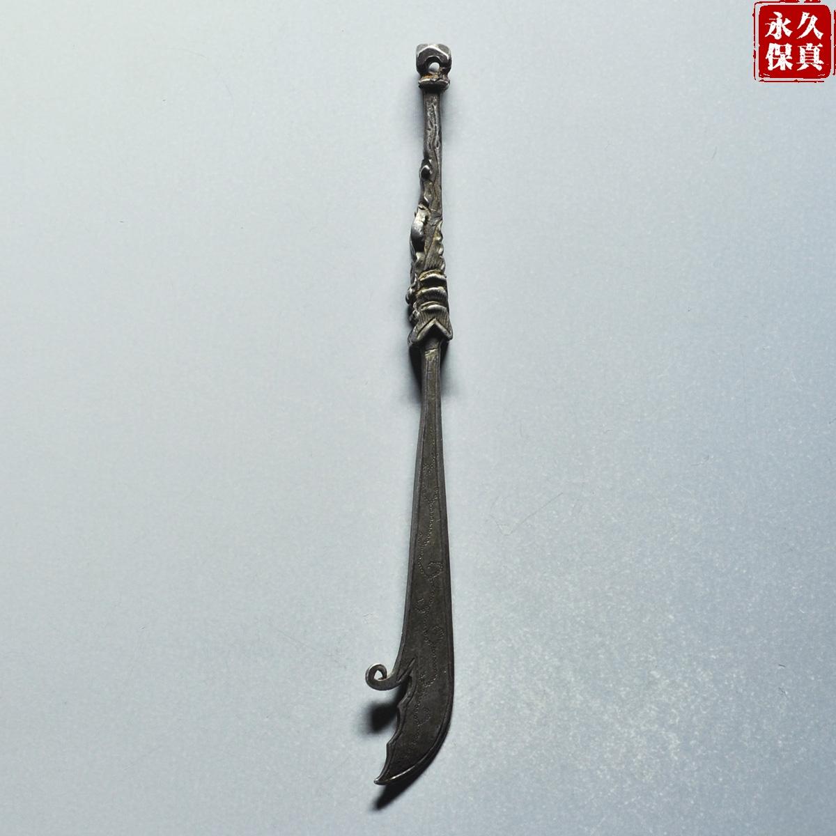传世美品、镇宅辟邪、寓意吉庆、晚清民国大关刀型老银挂饰,武财神关二爷的大关刀,长9.06厘米、重6.8克,古泉园地评级鉴定承保,品质保证,实价690元。