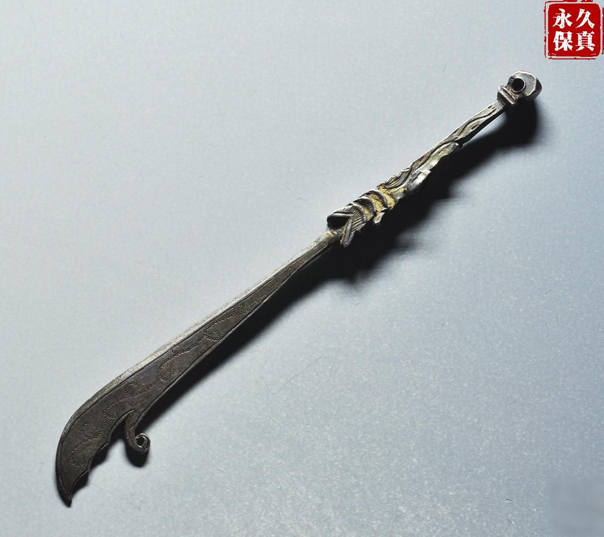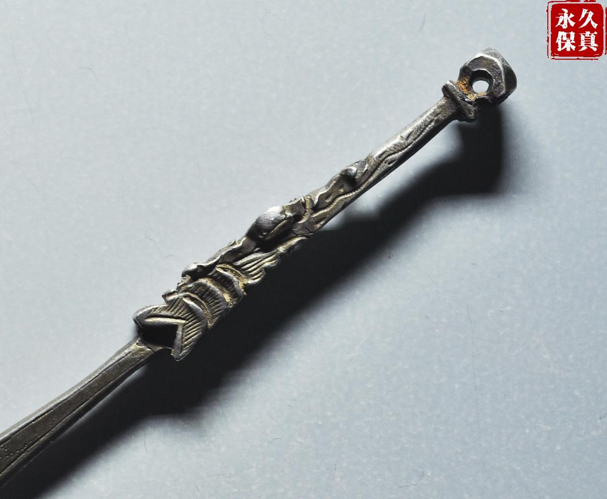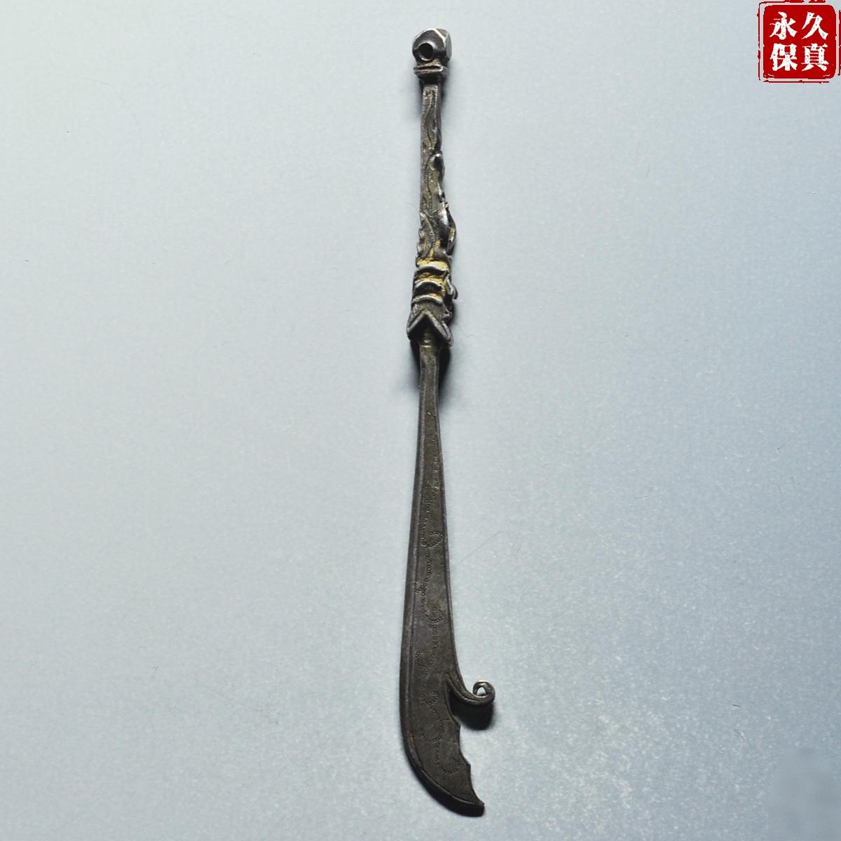 传世美品、镇宅辟邪、寓意吉庆、晚清民国大关刀型老银挂饰,武财神关二爷的大关刀,长9.06厘米、重6.8克,古泉园地评级鉴定承保,品质保证,实价690元。