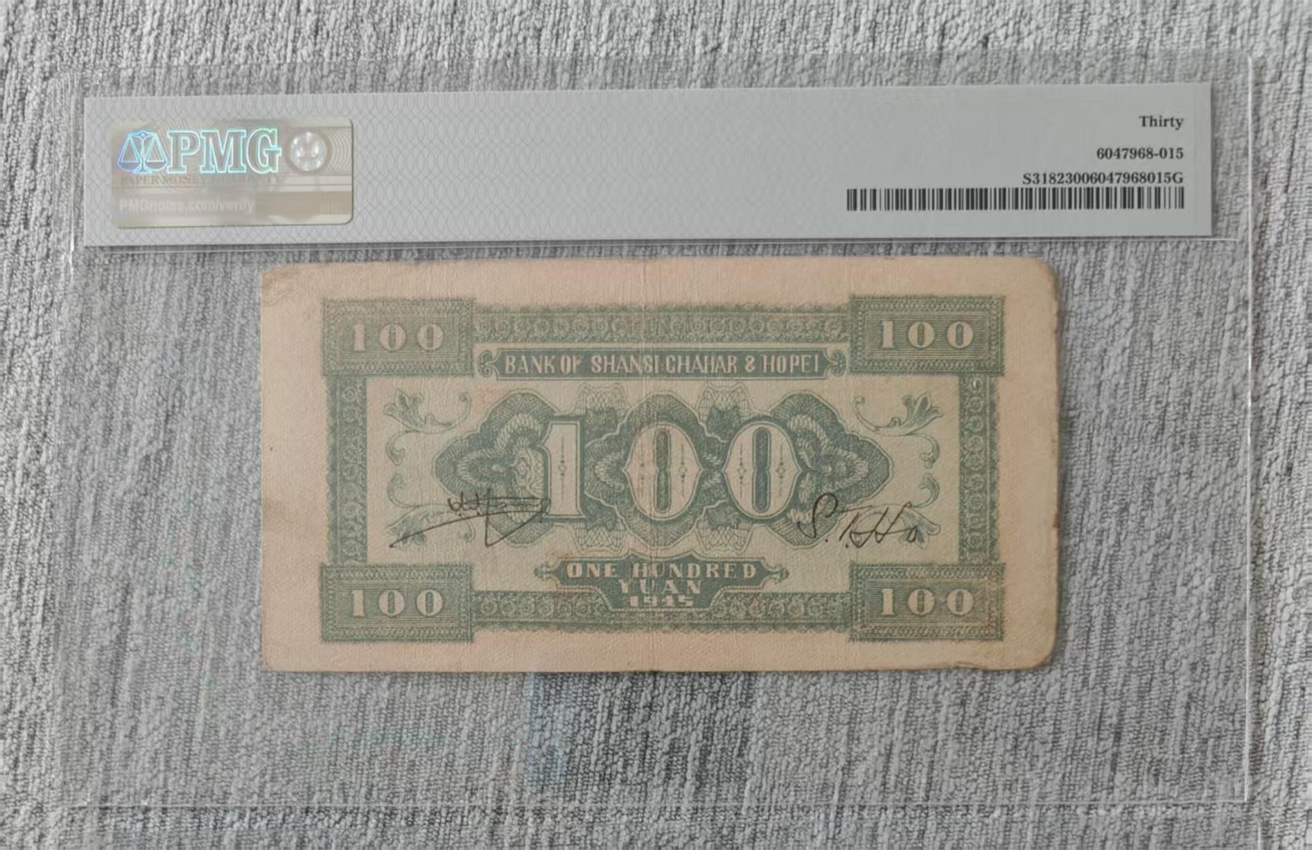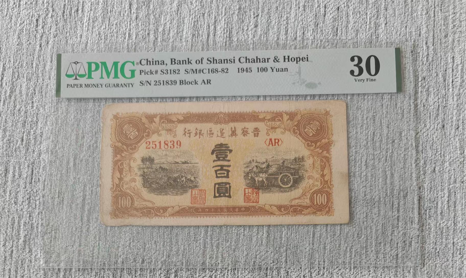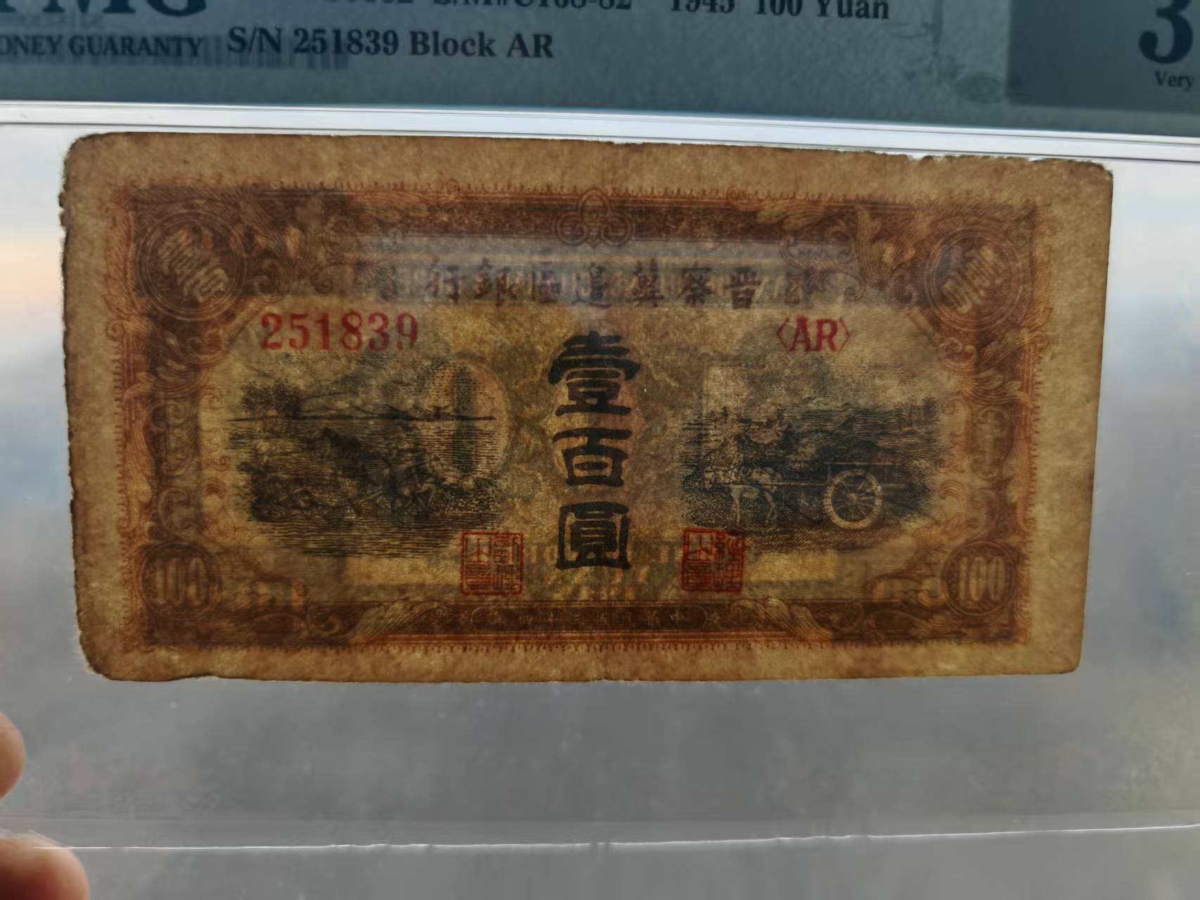 晋察冀两张PMG币,五元长城售出,壹佰元马车850元
