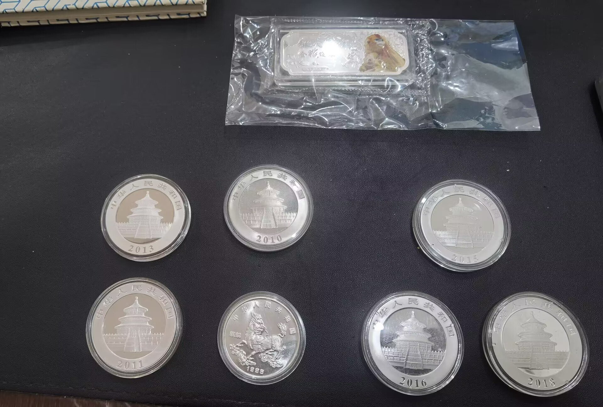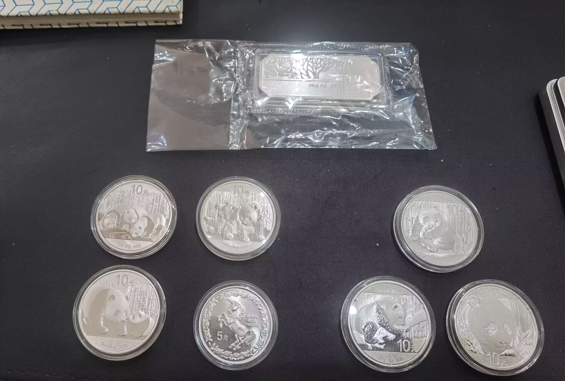 1盎司的3个,30克的3个,20克的96年麒麟银币一个,50克上海造币厂银条一个。