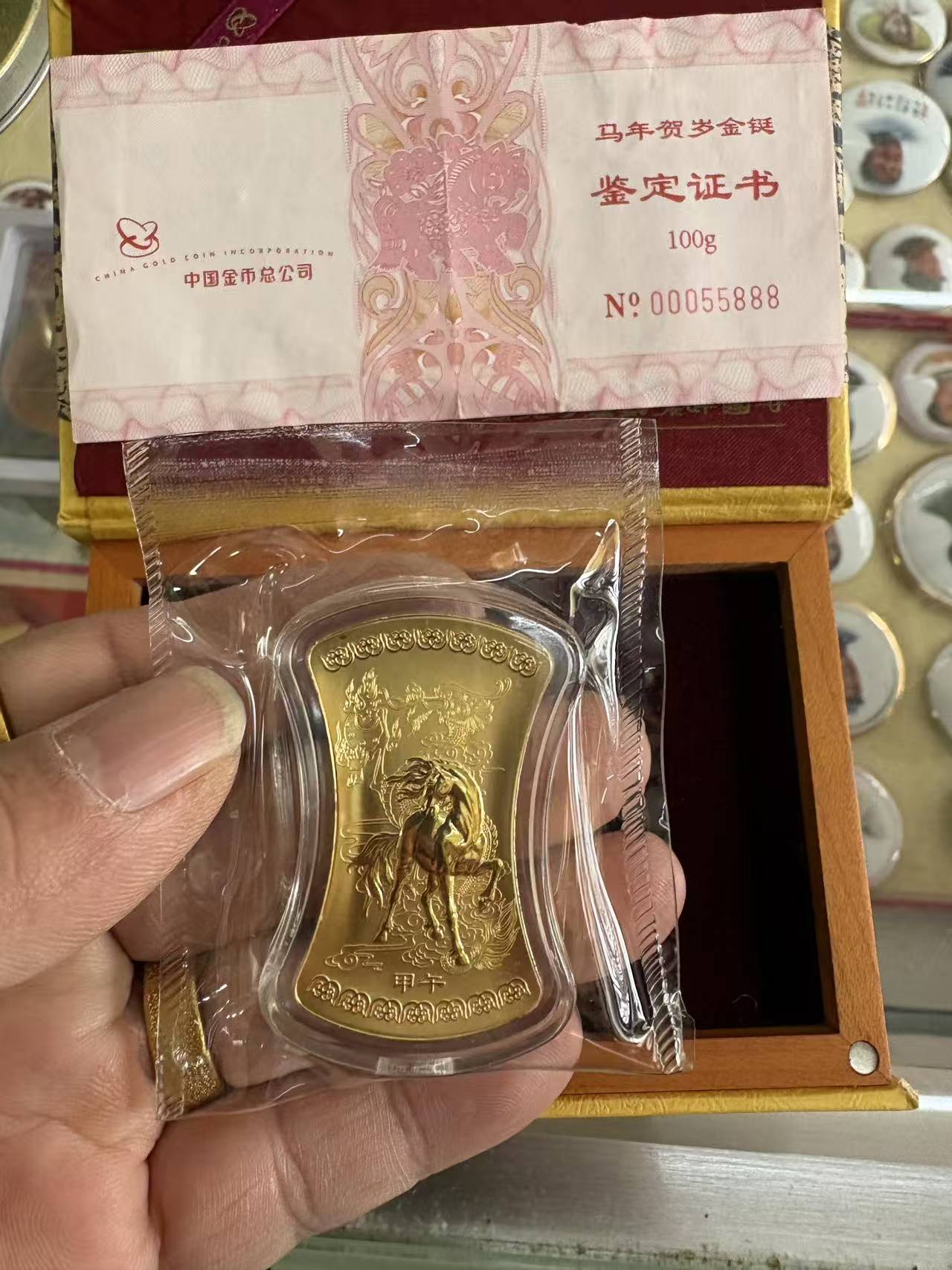 出售马年金挺100克,证书00055888,大盘金价➕20元一克,包顺丰
