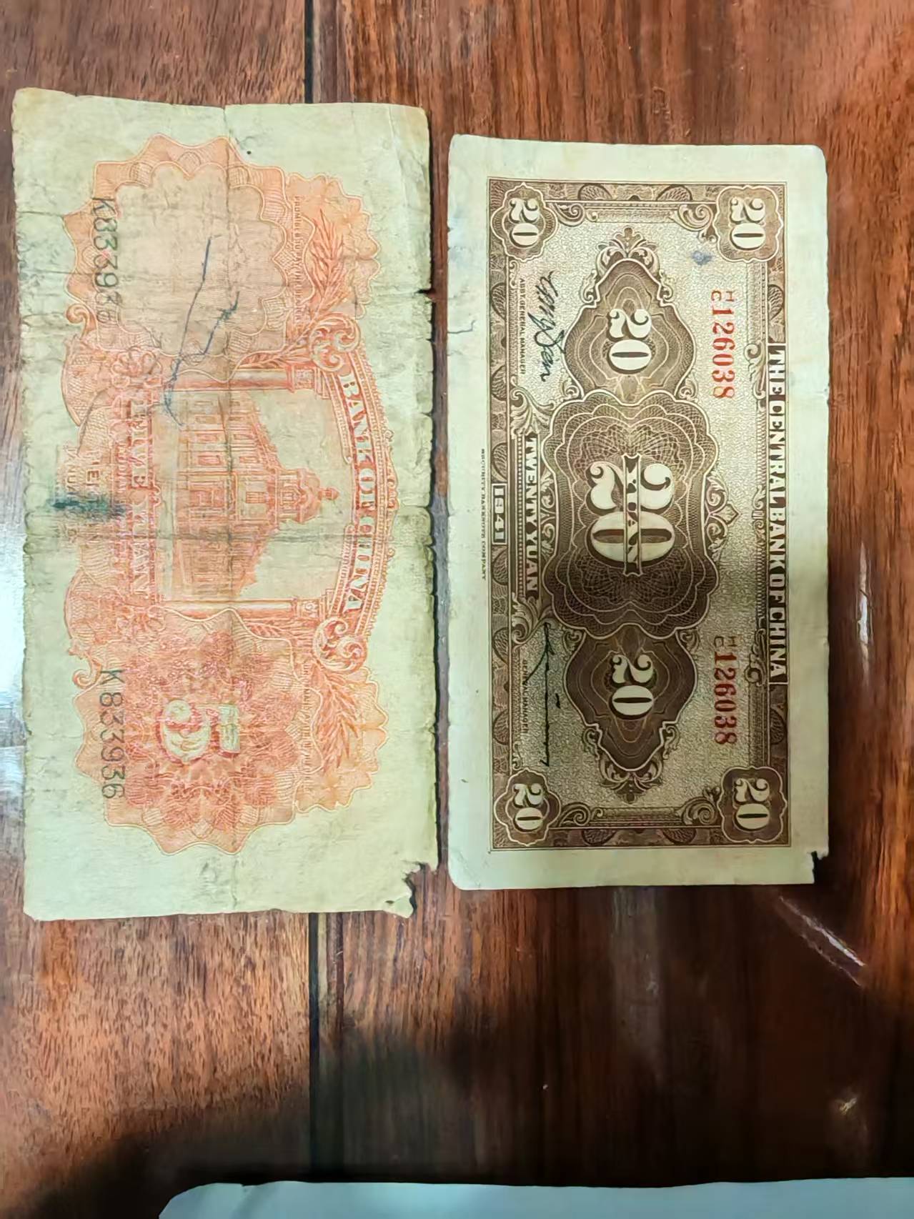 上海红两千中国银行5元中央20元