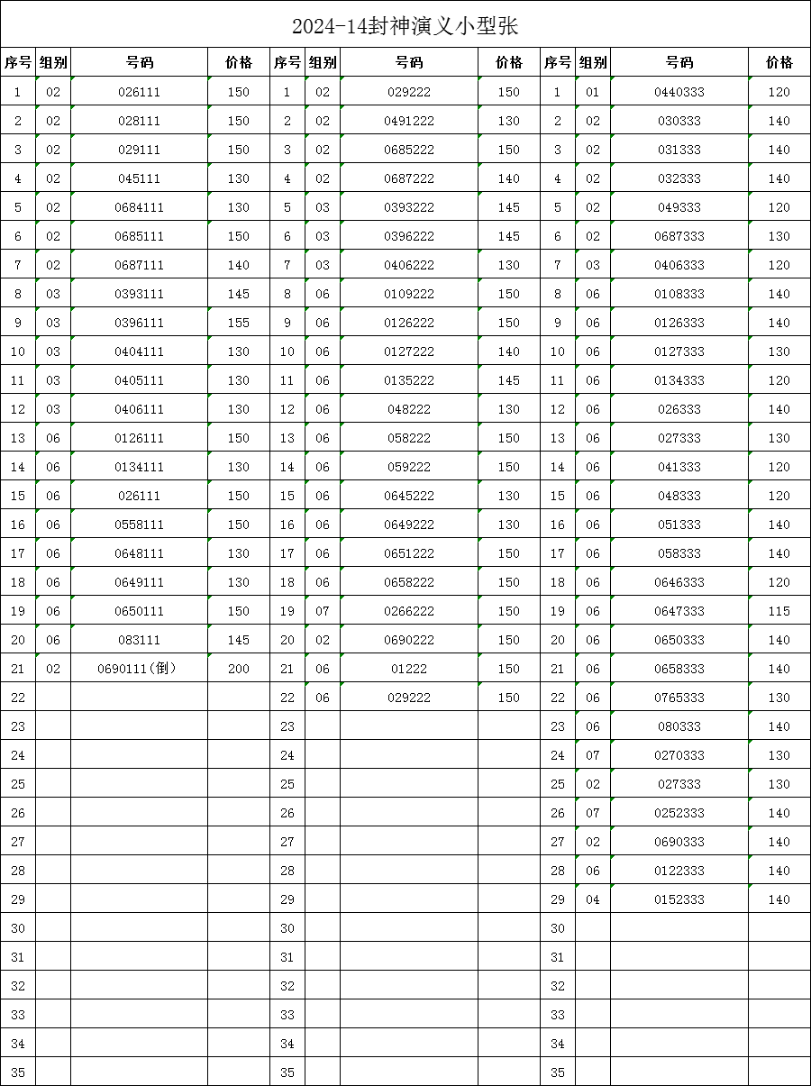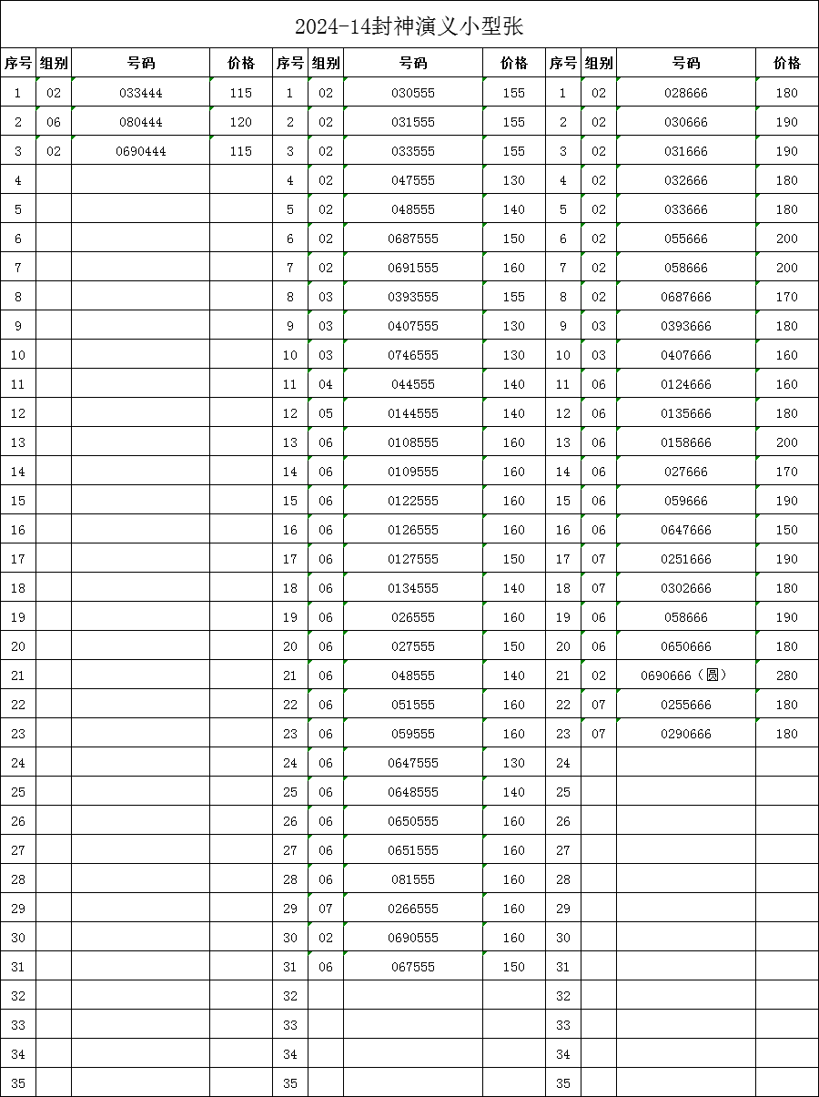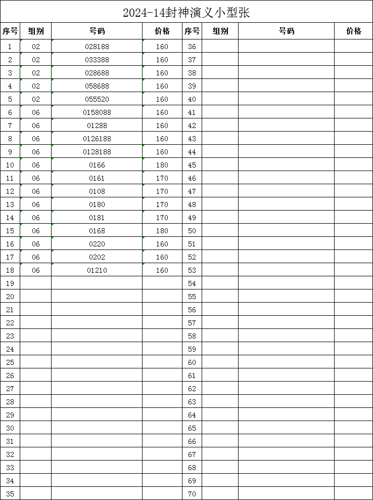 → 售2024-14封神演义小型张狮子号、888,豹子号,尾88,短号等