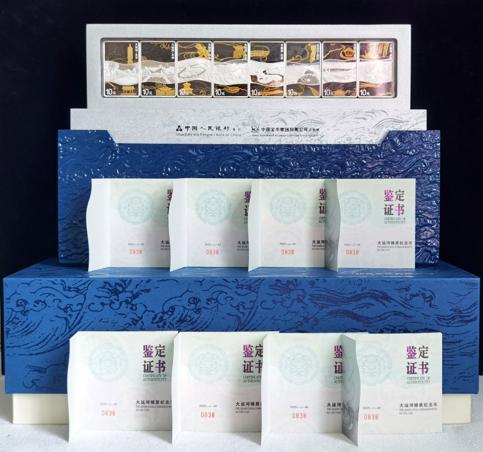 大运河1套8枚,总计240克,全程无47,证书号:0838,倒影王,无4 7尾8,证书、盒子完好。