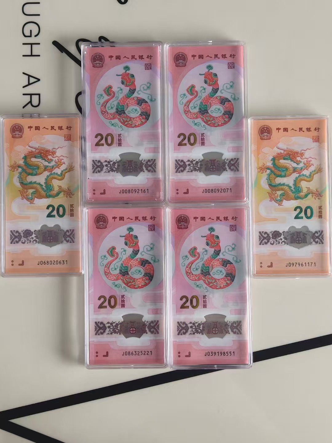 5680出如图6组龙/蛇钞标十,其中龙钞(金钩标十一组,无47全偶中国福标十一组),其中蛇钞(朦胧号,年份号标十一组,无247天马豹子号555标十一组,北斗年份号朦胧王龙珠王标十一组,无47豹子号222标十中国号一组)。一手货未曾流通市场,包品,款到发顺丰。确认后联系