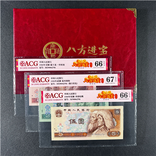 【8方进宝】四版5元+2元+1元三张全同号(9006圆圆号段)(配册) 爱藏65-67E(红标)
