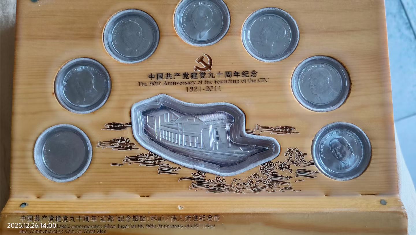 如题,七伟人纪念币内含毛刘周朱宋邓陈7伟人纪念币各1枚和1枚30克重南湖红船模型银锭,价650元。