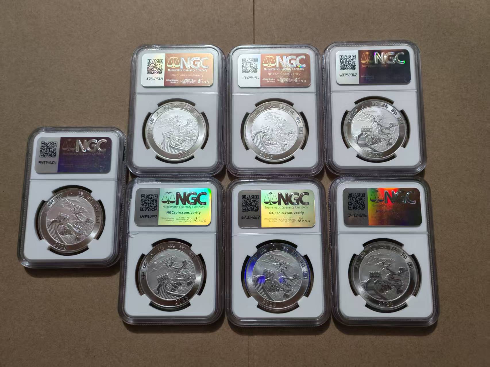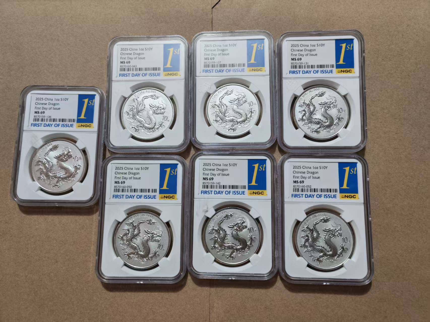 出7枚NGC MS69分 首日金兰标中国龙 盒子有微小瑕疵 看好确认 评级币售出不退。7×880 包邮 正面盒子上那些是之前贴的标签留下来的胶