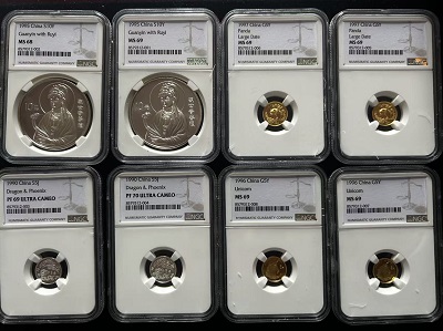 优售一些老币,1990版龙凤2克银币,1995年1盎司观音银币,1996版1/20盎司麒麟金币,1995版1/20盎司熊猫金币