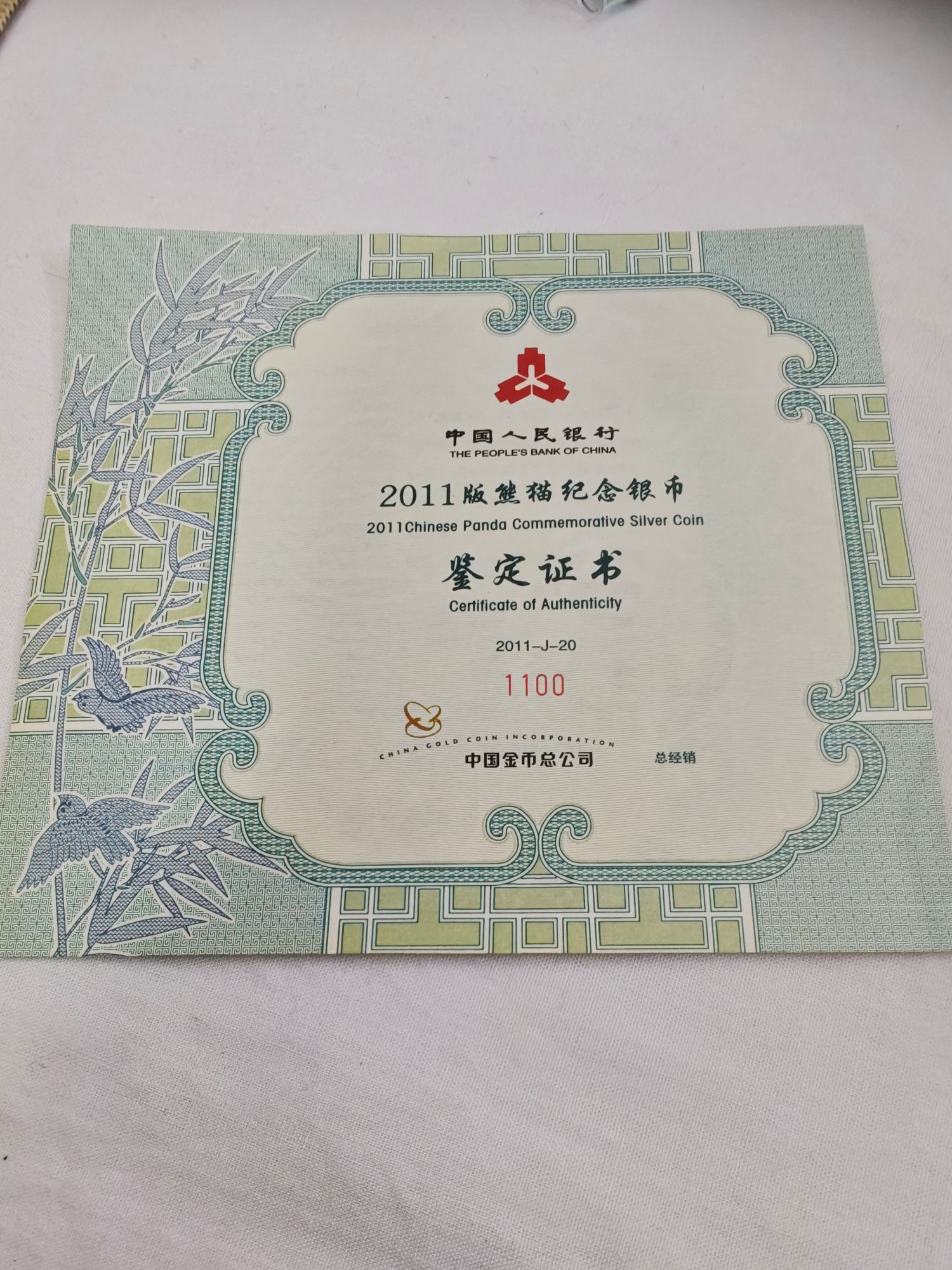 2011年公斤猫,证书号:1100,全程无2347,既是倒影号,又是倒置号。证书、盒子完好。